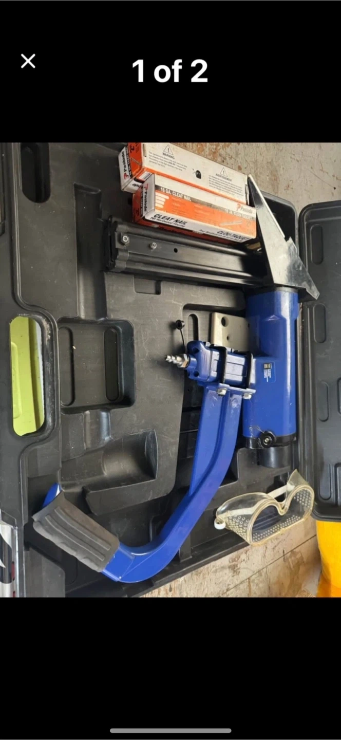This is a Power Fist 2" air flooring cleat nailer. It comes with a case and safety glasses. The nailer uses 16 gauge cleat nails.