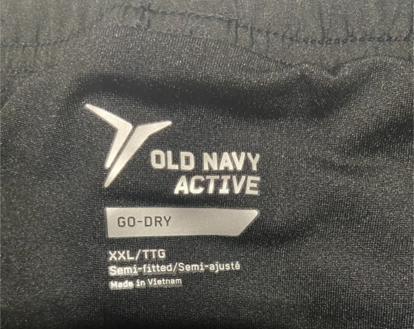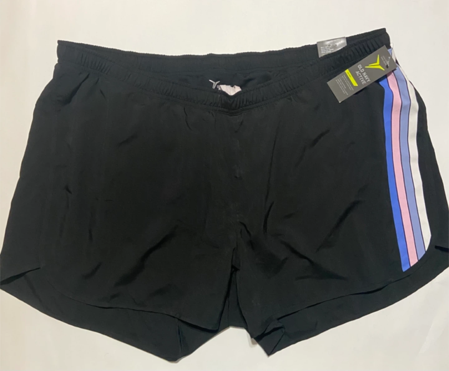 These are a new pair of Old Navy Active shorts in size XXL. They're black with a stylish stripe detail on the side. The tag shows they're semi-fitted and have GO-DRY technology, making them super moisture-wicking and comfy. They retail for $19.94.