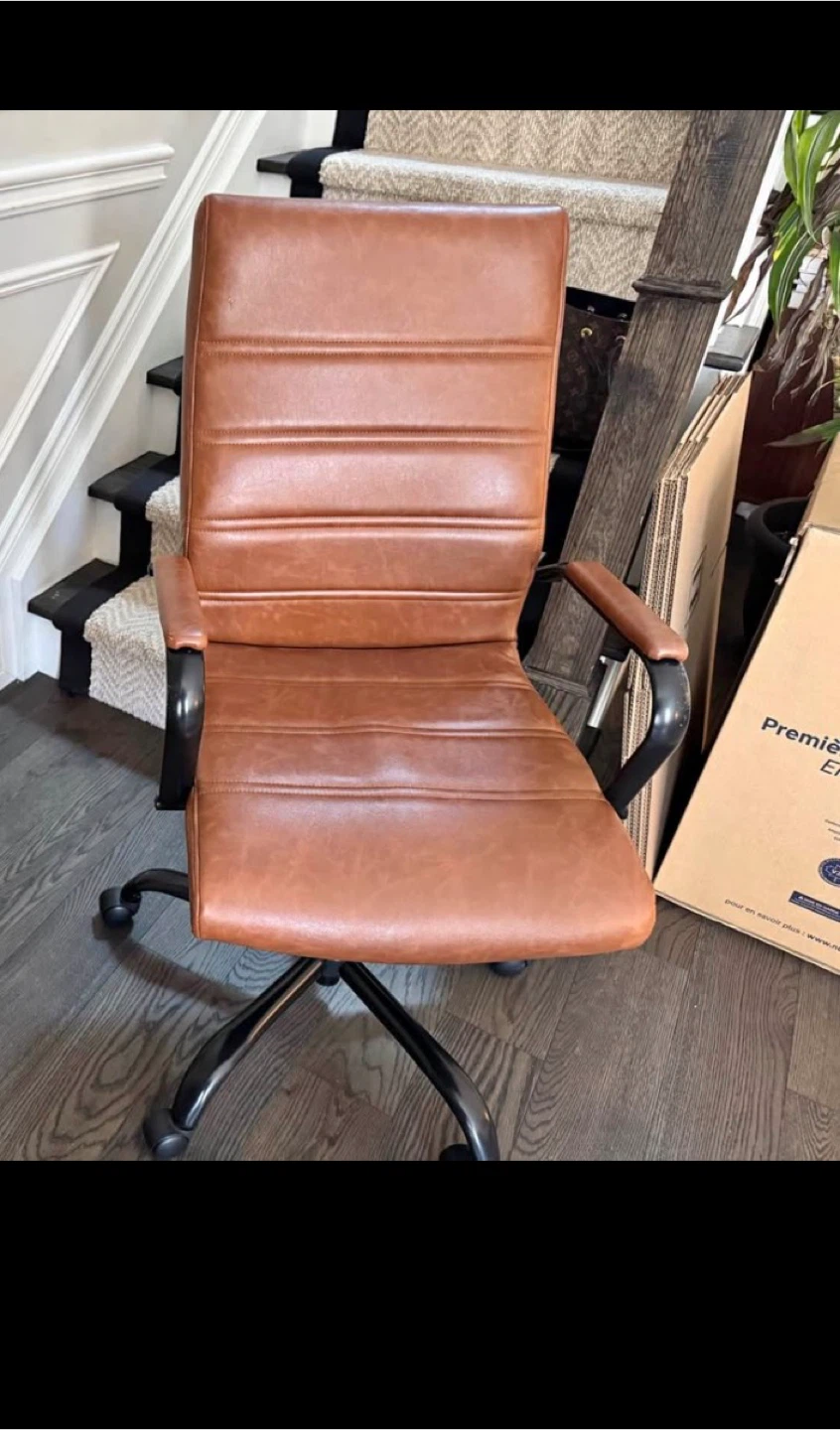 This is a stylish brown faux leather office chair. It features a padded seat and back with horizontal stitching for added comfort. The chair has a sturdy metal base with wheels for easy mobility. It's suitable for home or office use.