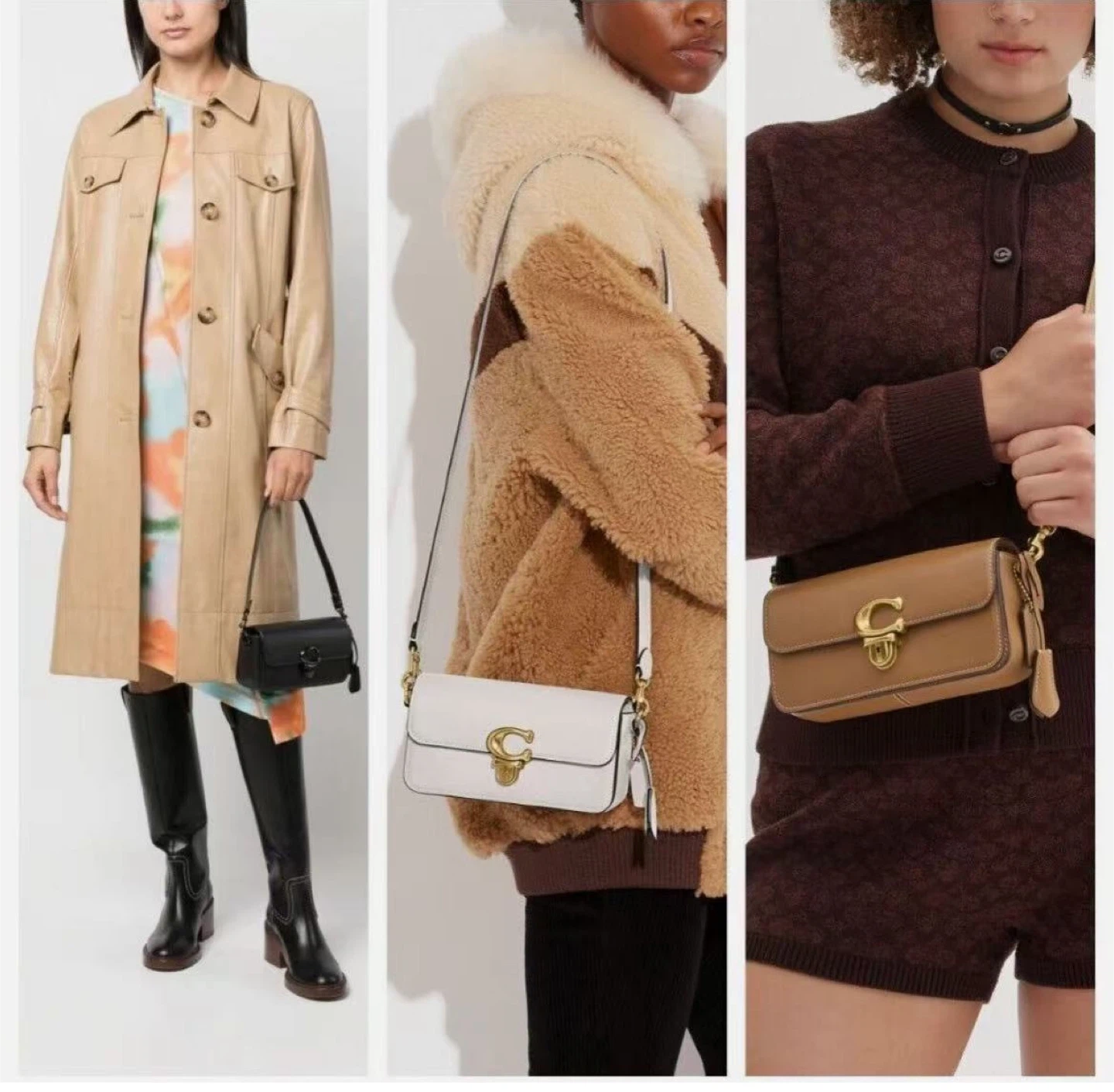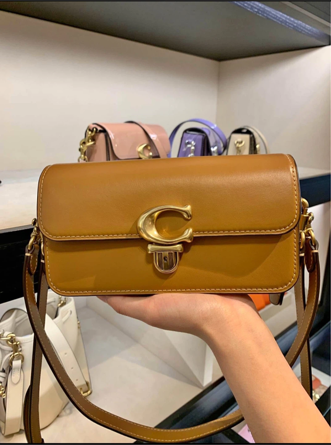 This stylish bag features the iconic Coach 'C' clasp. The colour is a beautiful tan/brown. It's the perfect size for everyday use and adds a touch of elegance to any outfit
