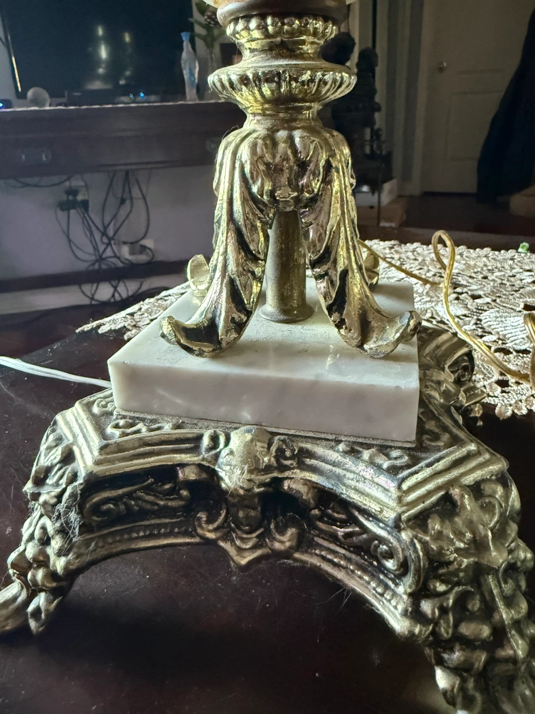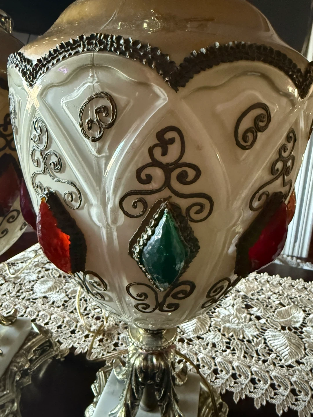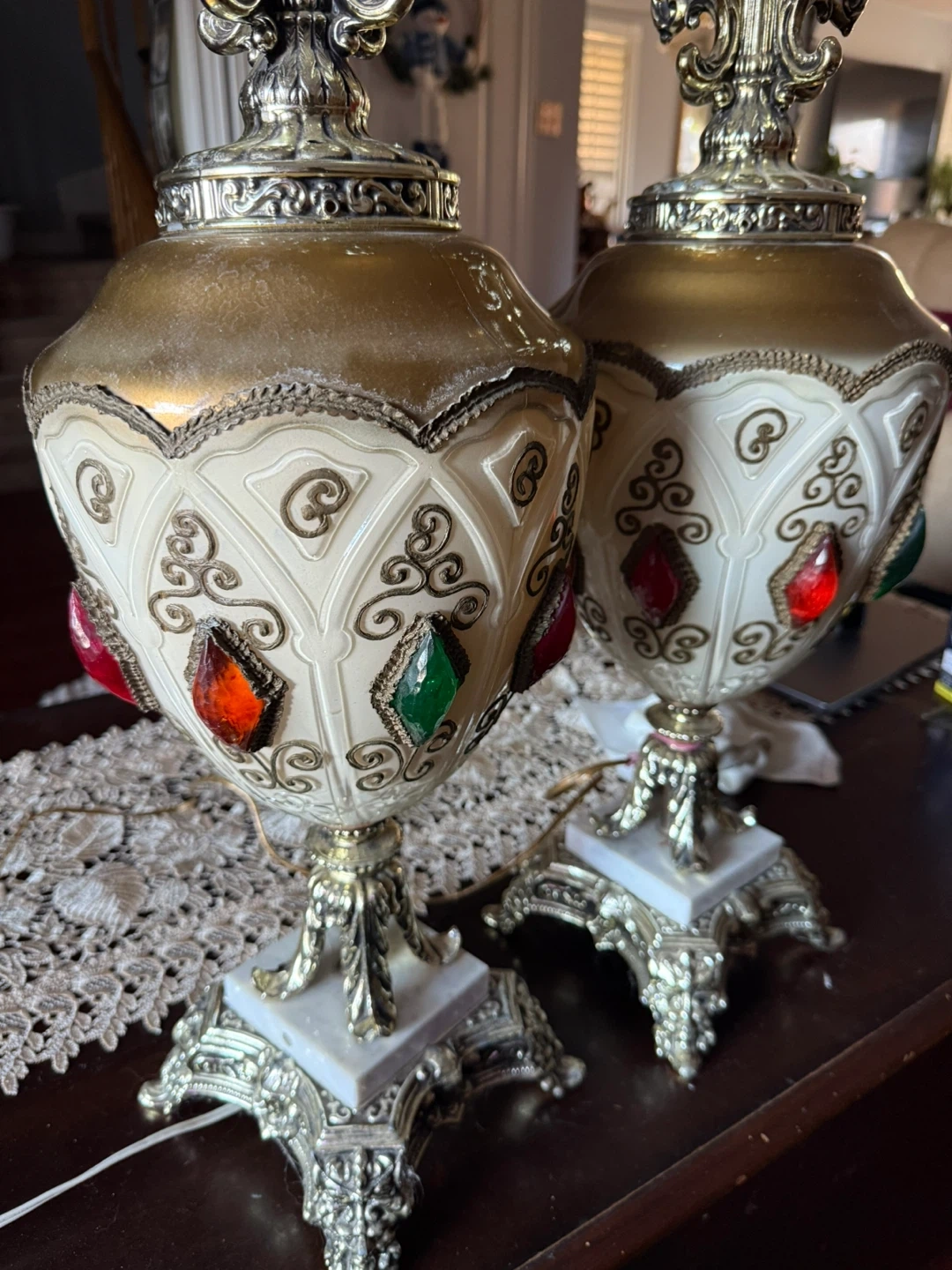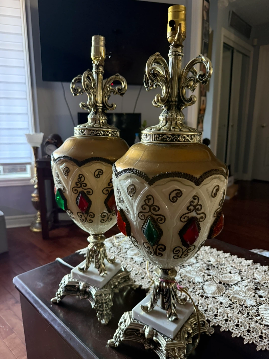 These vintage lamps have a unique ornate design with jewels. They're made of a gold-tone metal base and a cream-coloured ceramic body. This pair would add a classic touch to any room. 100 each