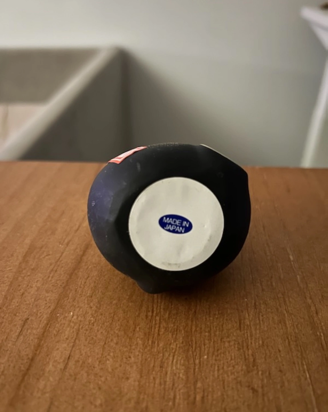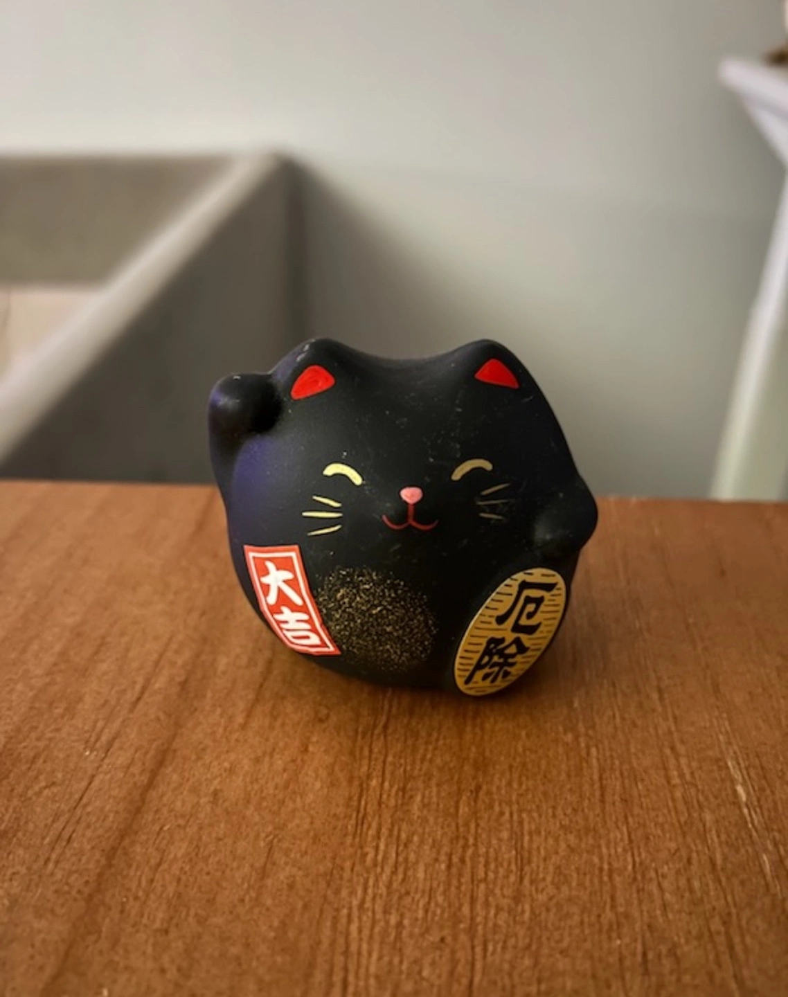 Adorable black Maneki-neko figurine. Made in Japan. Small size, perfect for a desk or shelf. Features gold detailing and kanji characters. Collectible item. Pick up Liberty Village.