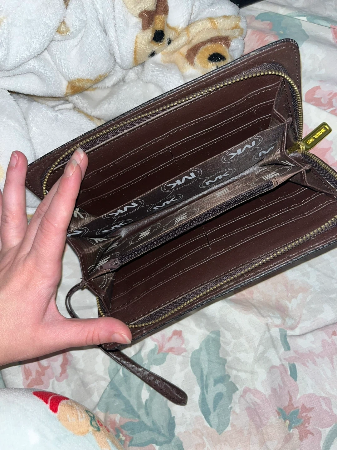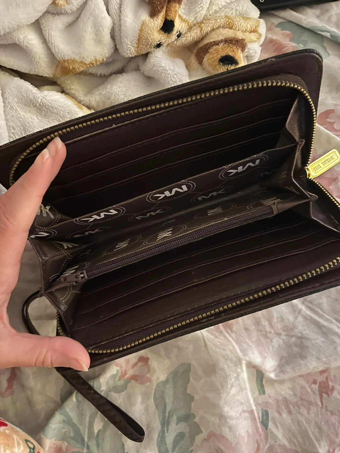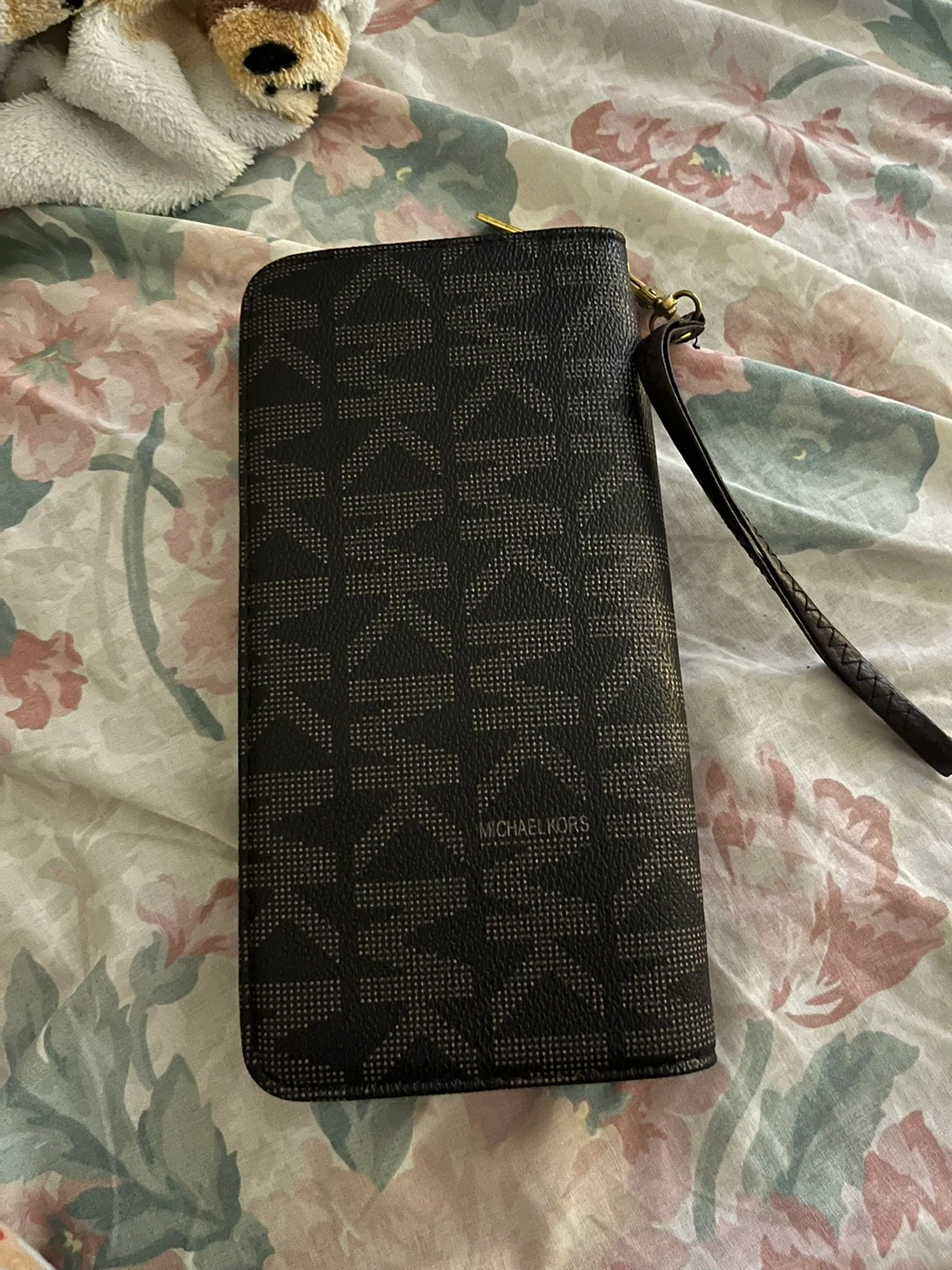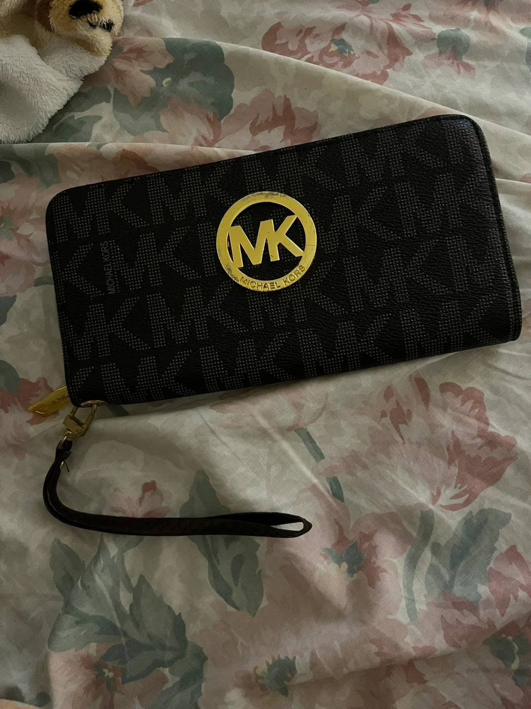 Selling a Michael Kors wristlet wallet. It's in good condition and has a zipper closure. Perfect for carrying your essentials! Perfect on the inside and just slight scratches on the MK metal emblem.