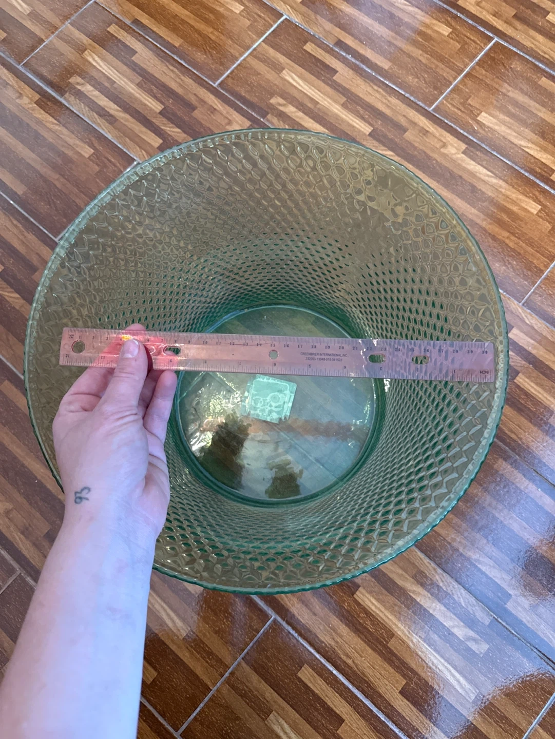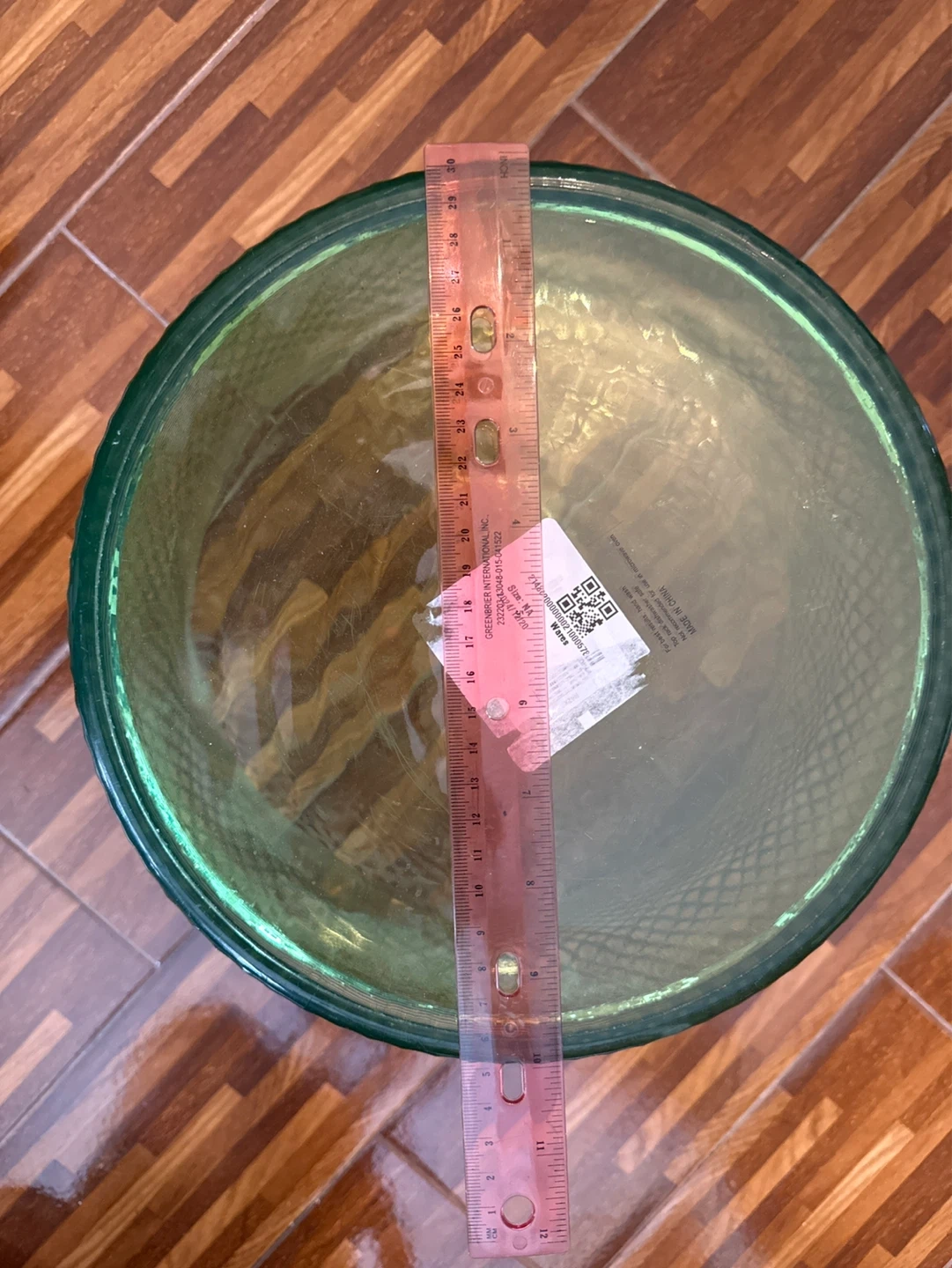This decorative glass vase features a diamond pattern. It's green and has a flared opening. Approximately 10 inches tall.