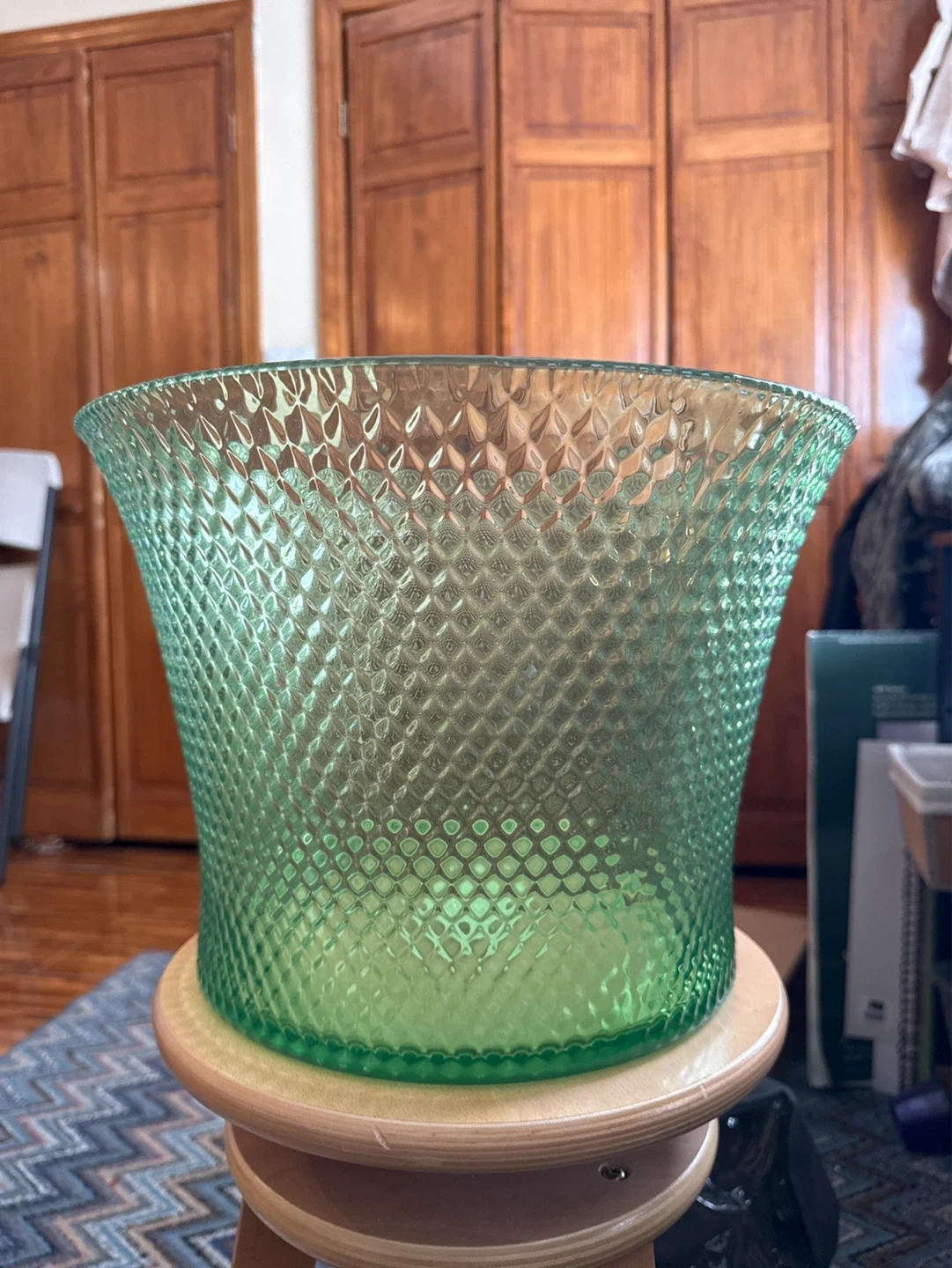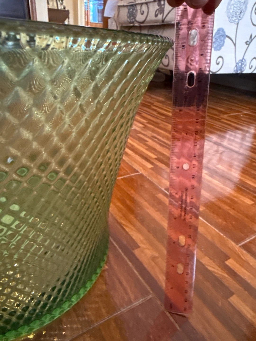 This decorative glass vase features a diamond pattern. It's green and has a flared opening. Approximately 10 inches tall.