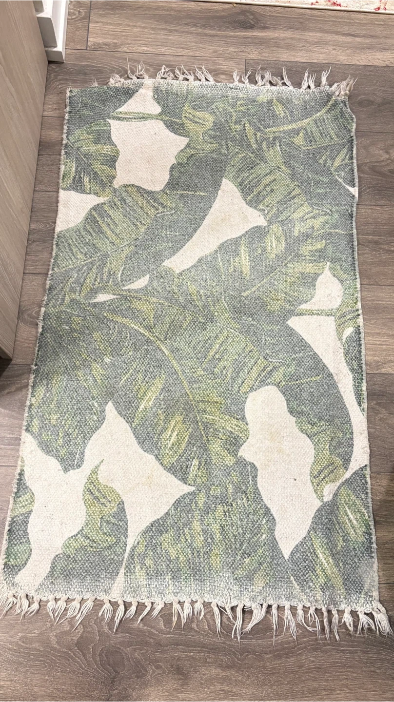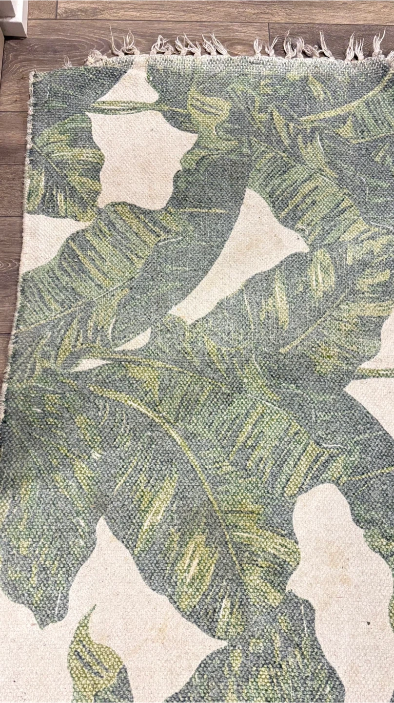 This area rug features a bold green tropical leaf pattern. It's a great way to add some colour to your space. The material appears to be a woven fabric with fringe detailing on the ends.