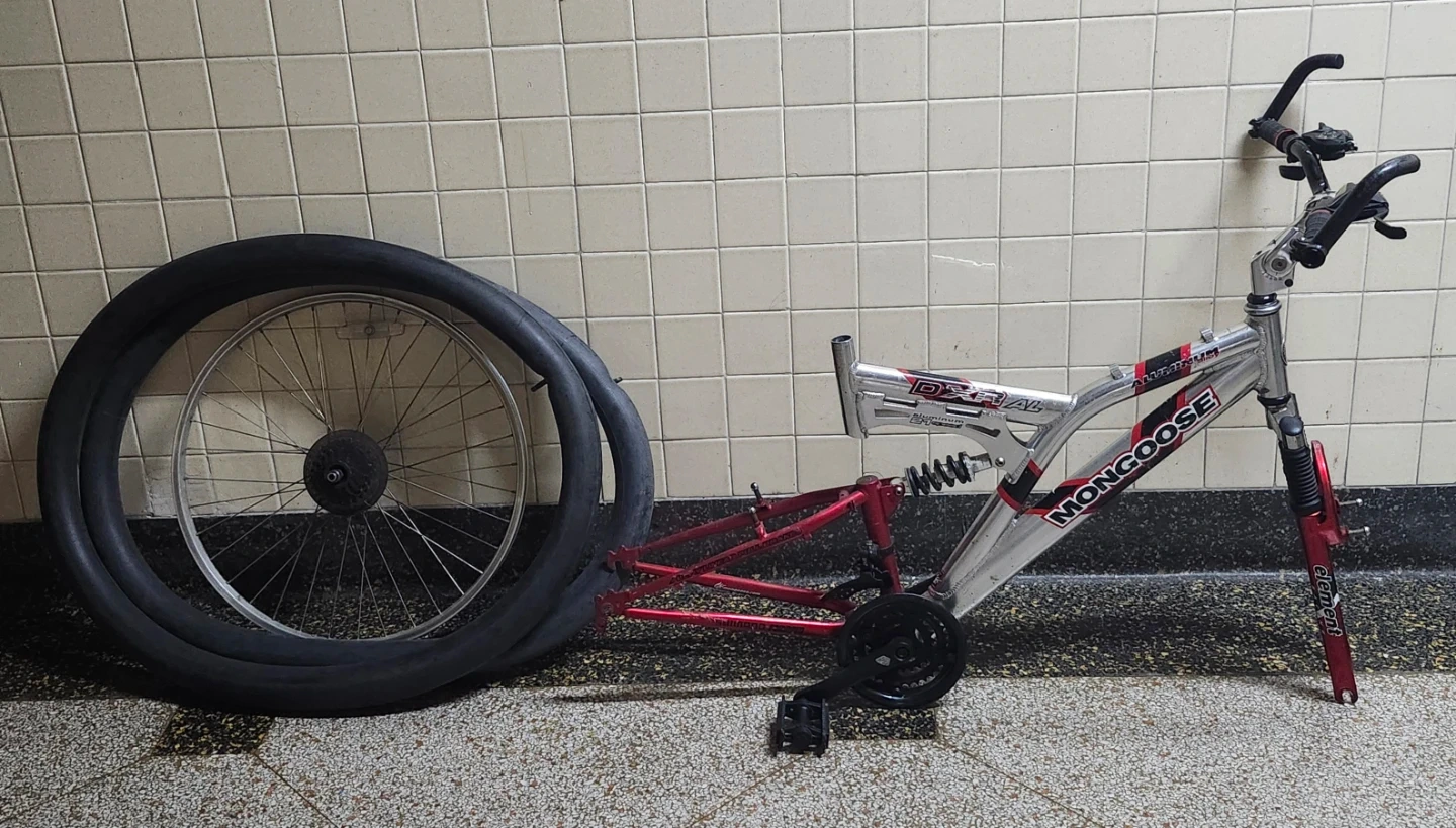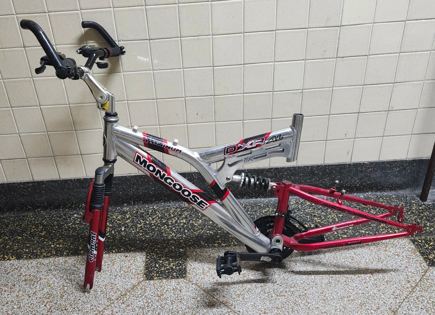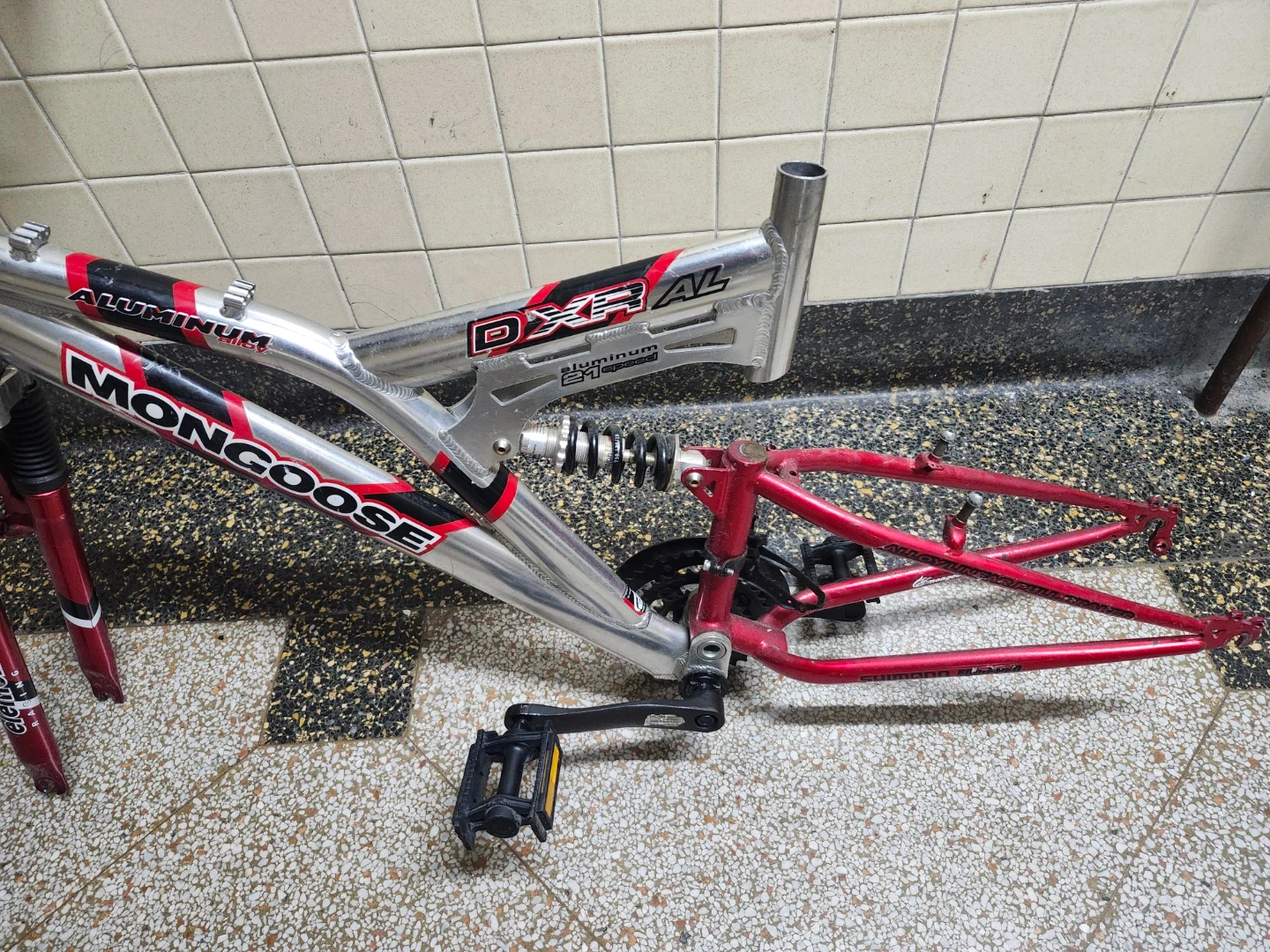 Mongoose DXR AL Aluminum 16 3/4" Full Suspension Frame, front rim, and 2 inner tubes for parts or repair.