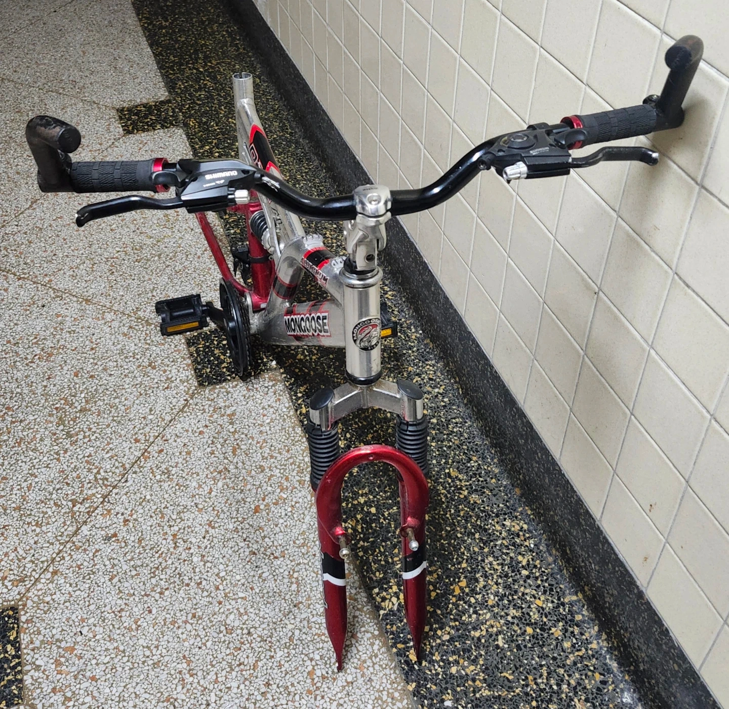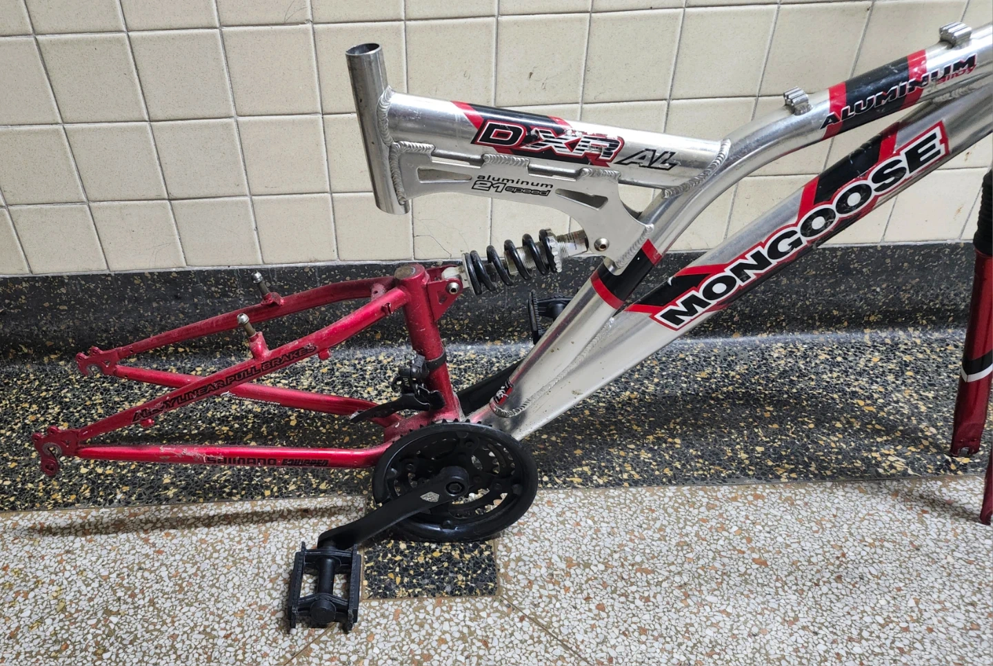 Mongoose DXR AL Aluminum 16 3/4" Full Suspension Frame, front rim, and 2 inner tubes for parts or repair.