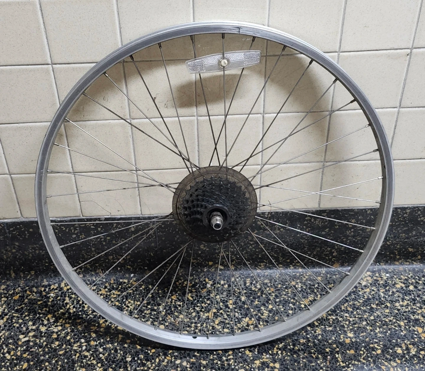 The size of the rims for this bike are 26". The front fork suspension is free moving and not frozen. The front rim is true. Both inner tubes hold air. Both inner tubes will be deflated.