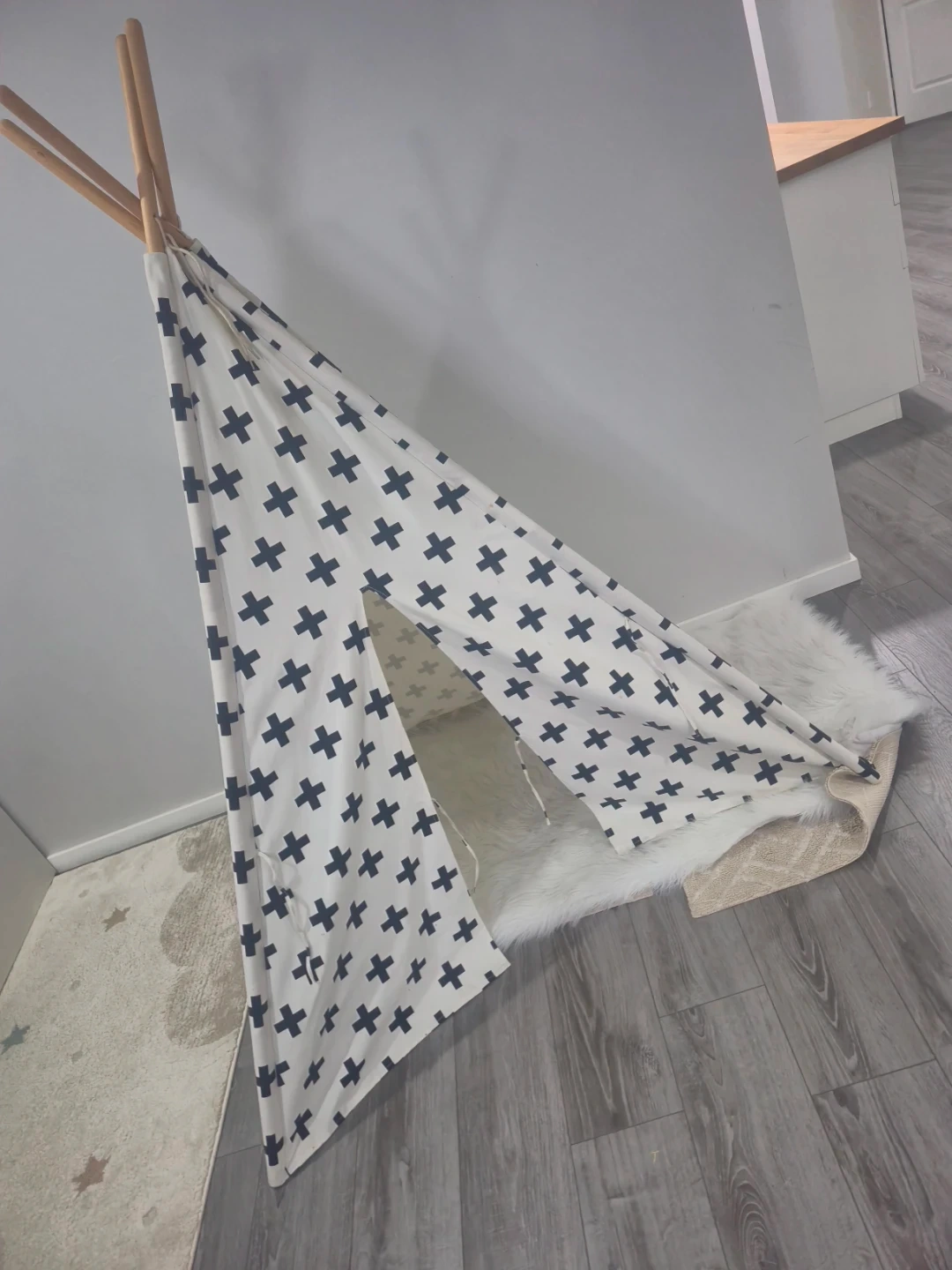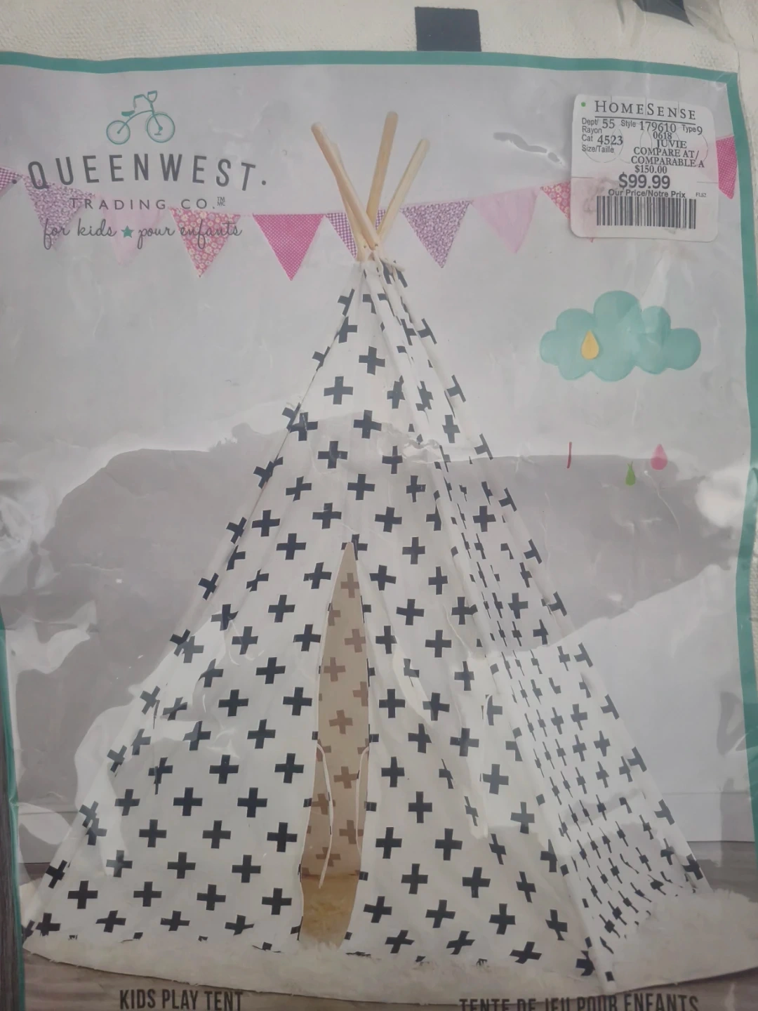 I have a brand new Queenwest Kids Play Tent still in its original packaging! The tent features a cute plus sign pattern and comes with the poles for easy setup. Originally bought for $99.99, it's a fun and stylish addition to any kid's room or play area