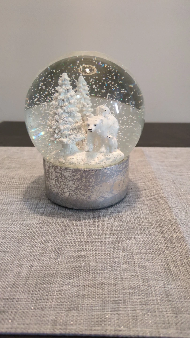 Charming snow globe featuring a polar bear family and snowy trees. It's perfect for adding a festive touch to your holiday decor. Shake it up to see the glittery snow fall!