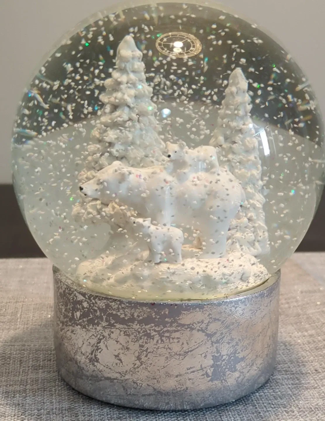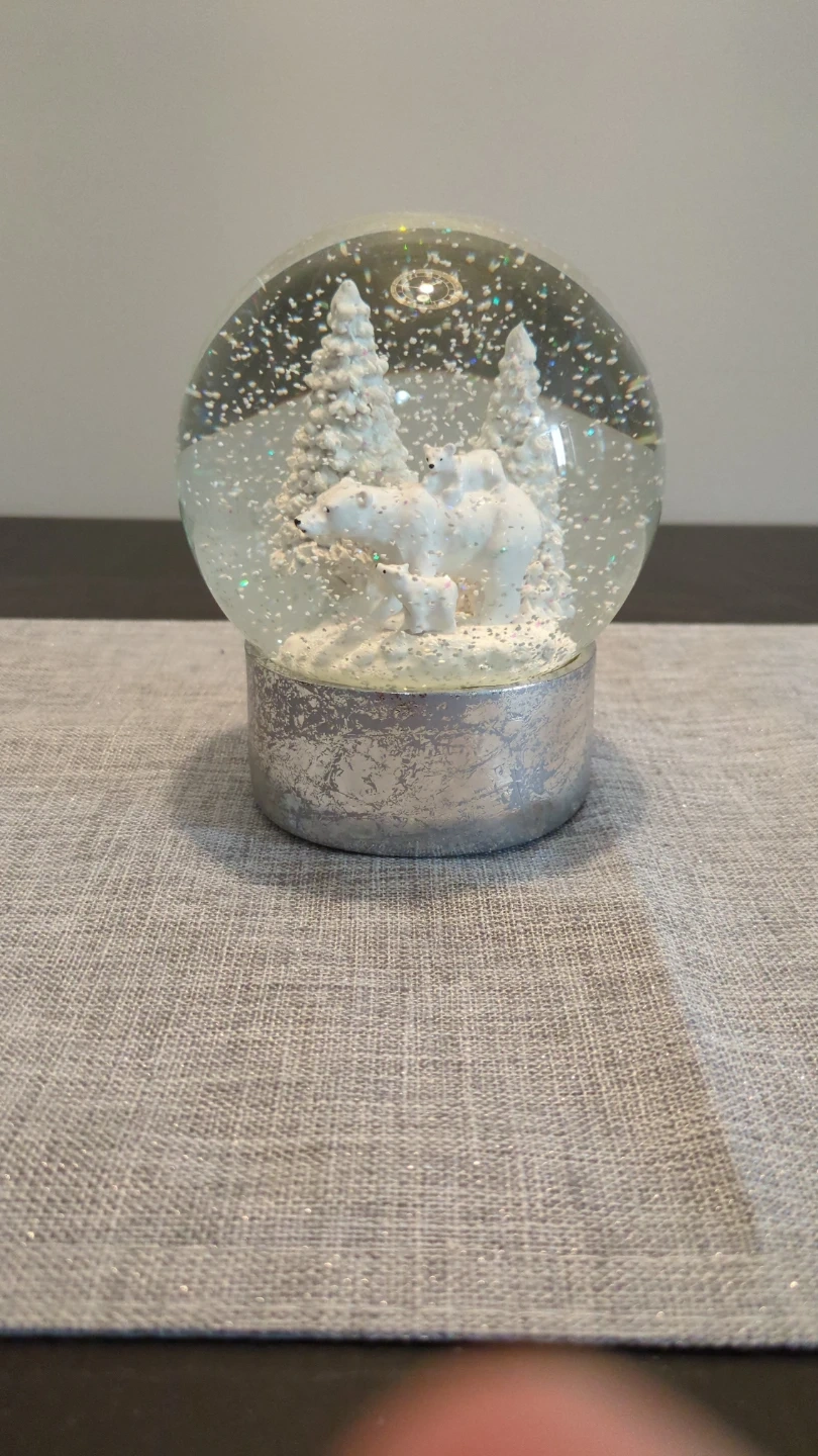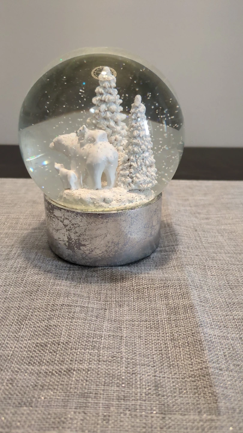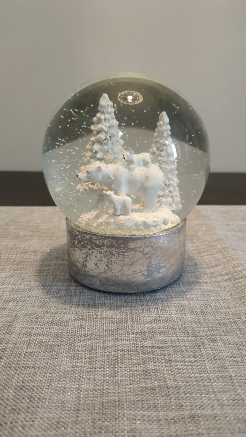 Charming snow globe featuring a polar bear family and snowy trees. It's perfect for adding a festive touch to your holiday decor. Shake it up to see the glittery snow fall!