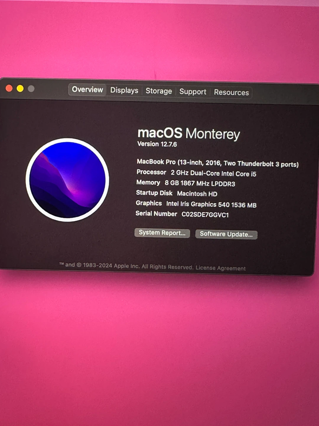 Selling a 2016 Apple MacBook Pro with a 13.3-inch Retina display. It's powered by a 2 GHz Dual-Core Intel Core i5 processor and has 8 GB of 1867 MHz LPDDR3 memory. Running macOS Monterey version 12.7.6. This laptop comes with 3 Thunderbolt 3 ports.