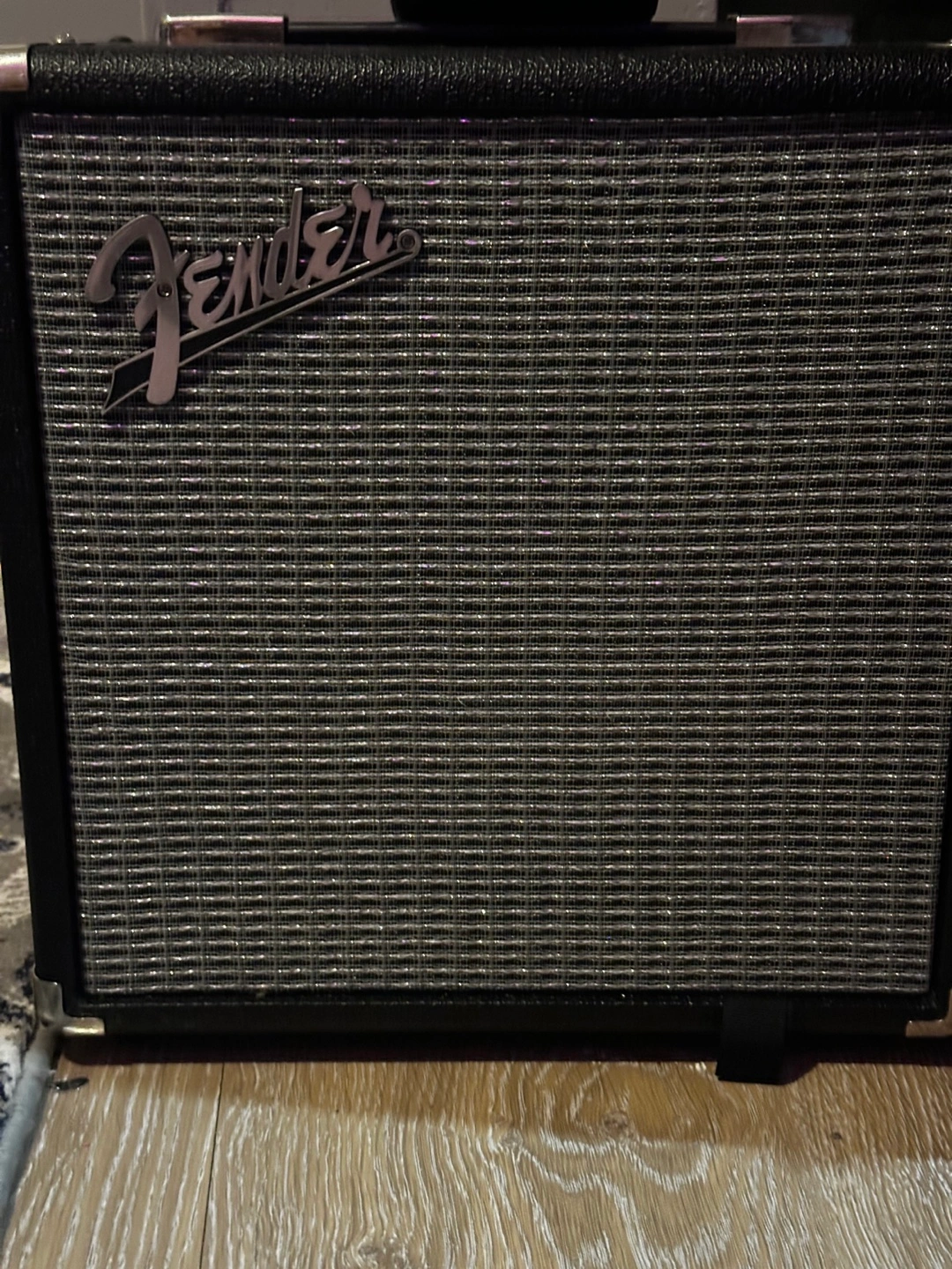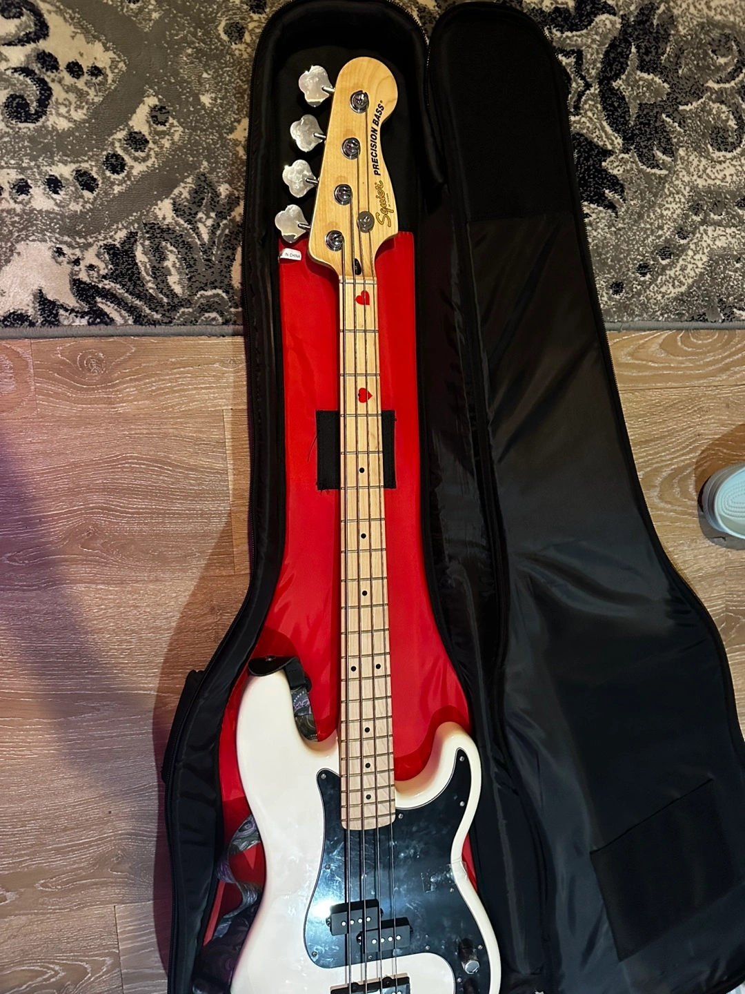 An amplifier with a silver front, a black cabinet, and a silver emblem. A bass guitar is also included. The guitar appears to be white with a black pickguard and has a red interior case, a great set for practicing and playing music at home. These items are I mint condition. Willing to bargain, make an offer. PRICE STATED Is FOR ALL PIECES!!! Make an offer for all or separate