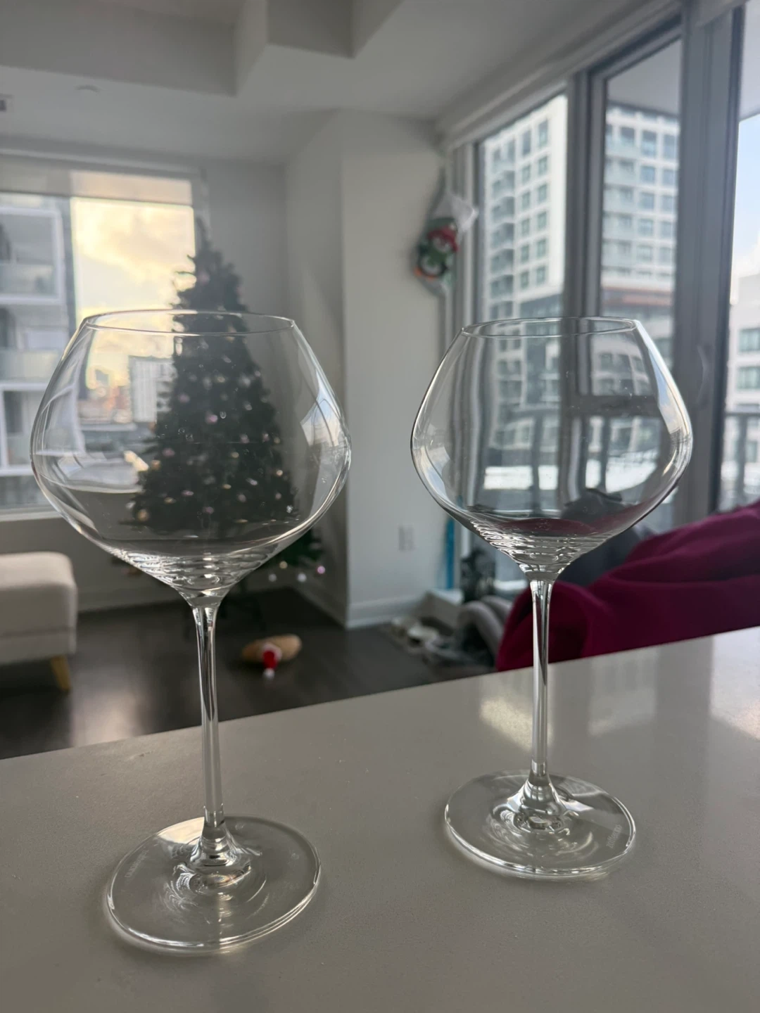 Selling a set of two elegant wine glasses. They would be perfect for your next dinner party or a quiet evening at home!
