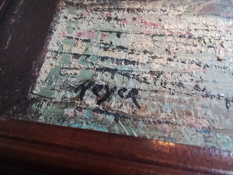 A wonderful original oil painting. Features a classic architectural scene. Shows a couple of figures standing. The painting is encased in a dark, wooden frame. Adding this piece to your space will create a calm atmosphere.