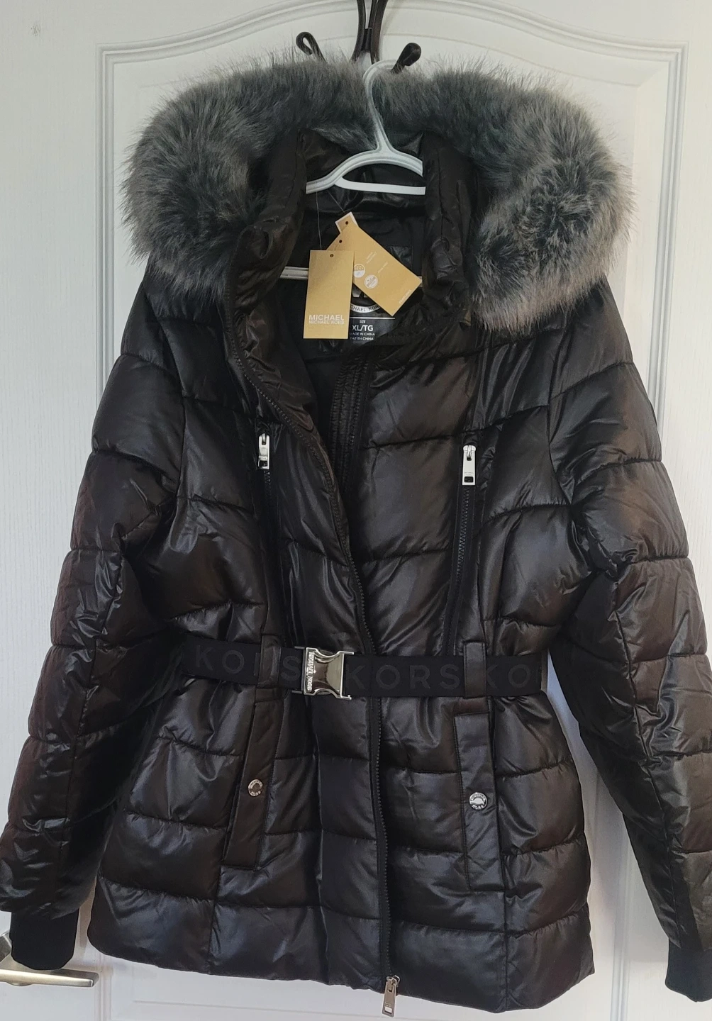 This is a black Michael Kors puffer jacket. It features a removable faux fur-trimmed hood and a belted waist with the MK logo. Size is XL.
