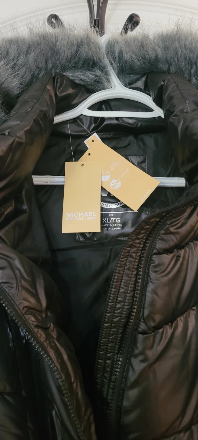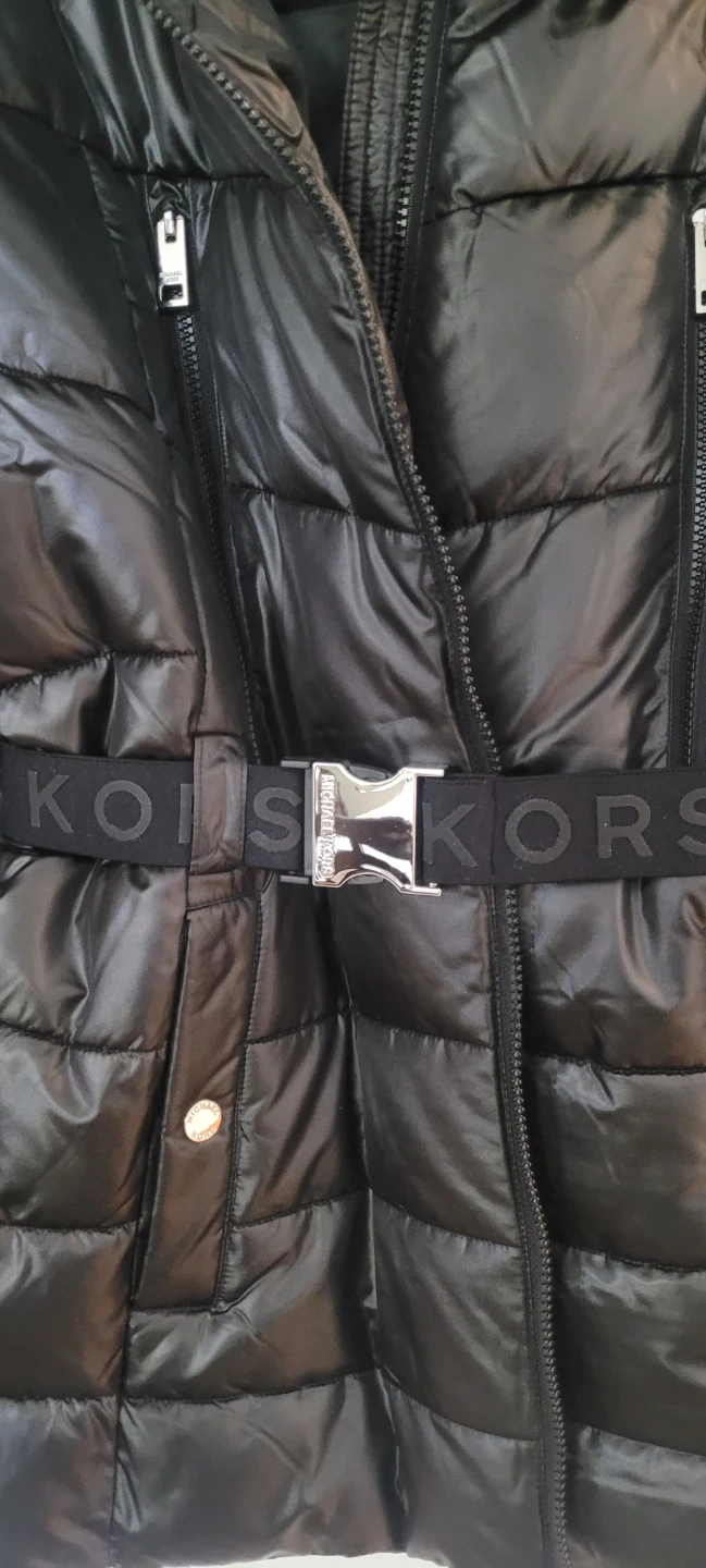 This is a black Michael Kors puffer jacket. It features a removable faux fur-trimmed hood and a belted waist with the MK logo. Size is XL.