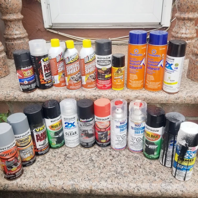 New & pre-owned. I have a selection of spray paint cans available. Brands include Rust-Oleum, Dupli-Color, Permatex, and Gorilla. There are various types, such as surface shield, reform seal, automotive headliner adhesive, engine primer, high heat, and more. Perfect for your next project!