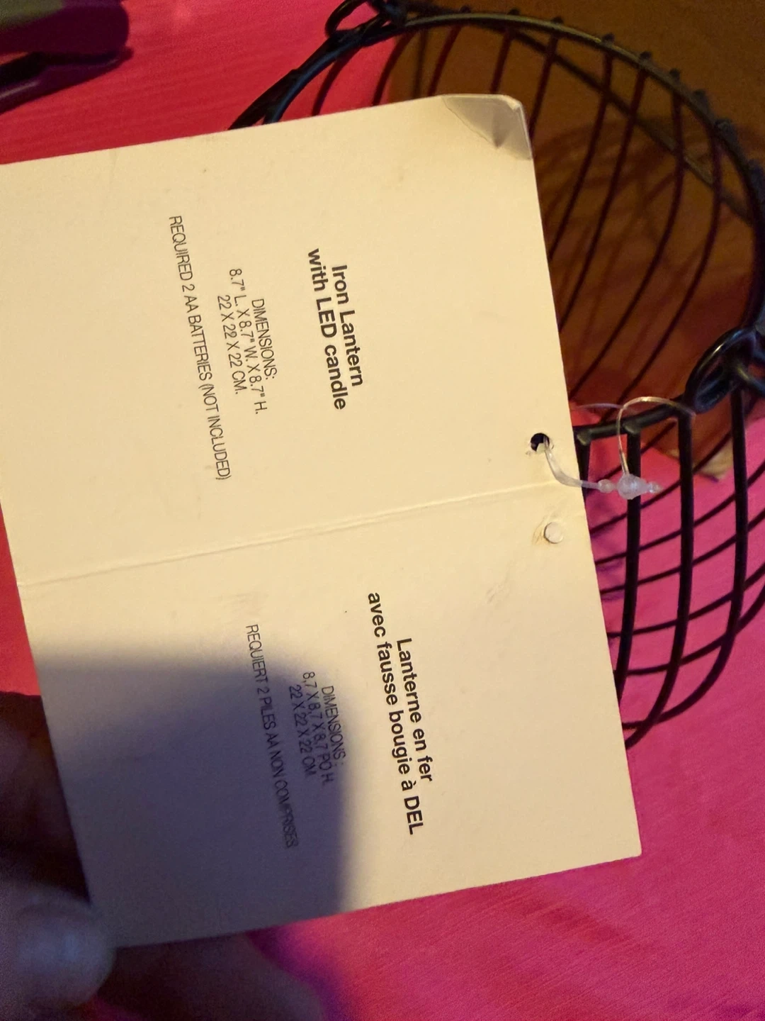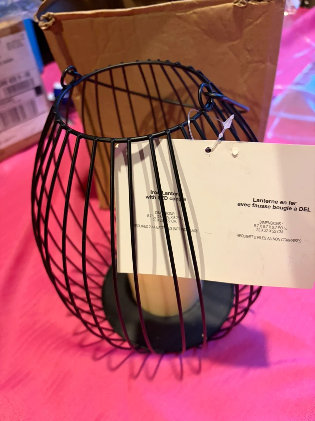 This is a black iron lantern with an LED candle. It's 8.7" L x 6.7" W x 7" H (22 cm x 17 cm x 18 cm). Requires 2 AA batteries, not included.