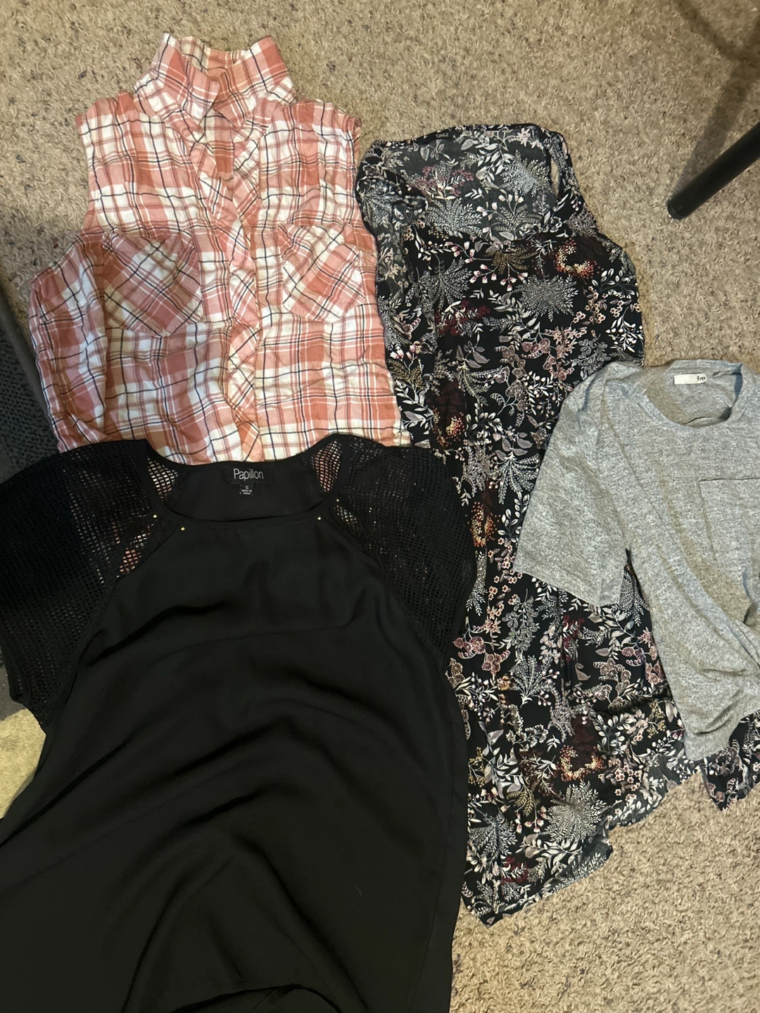 Bundle includes a sleeveless pink plaid shirt, a black floral print dress , a top with mesh sleeves, and a grey t-shirt. This assortment offers a variety of styles for everyday wear.