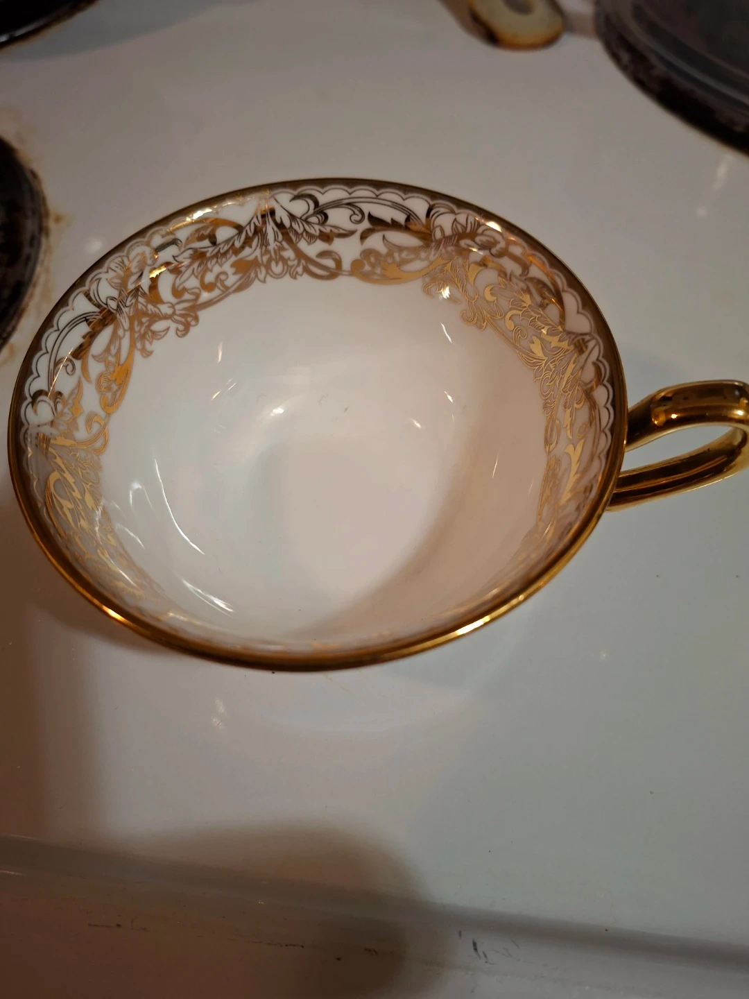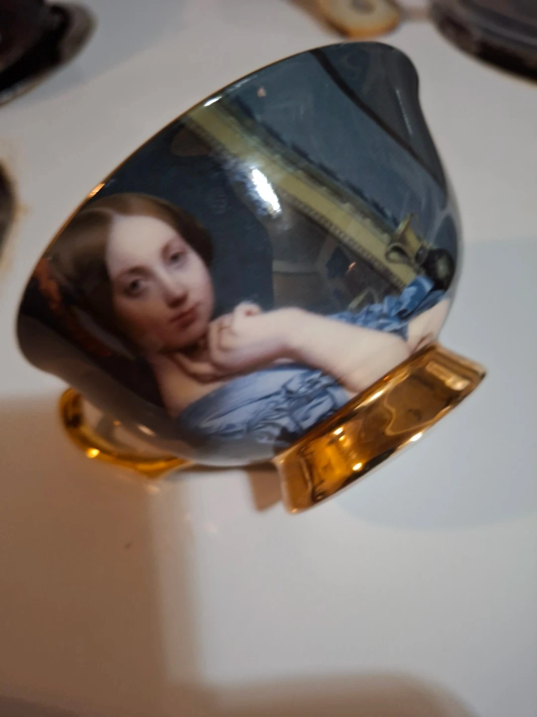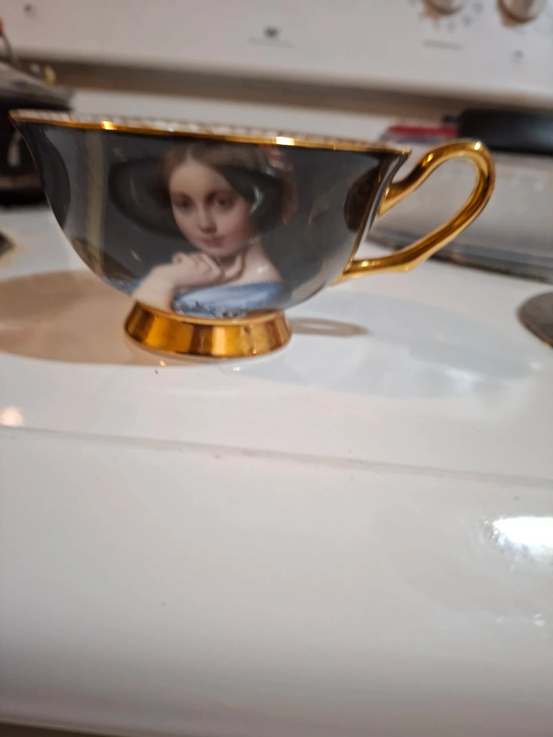 This EUART cup is made from fine porcelain bone china. It features a decorative painting of a woman and has a gold-trimmed handle and base. It's a lovely piece for display or use.