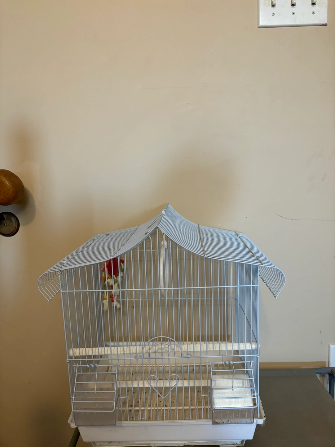 White bird cage with a small perch and two food dishes. The cage comes with a dangling toy. It has a roof and is on a base.