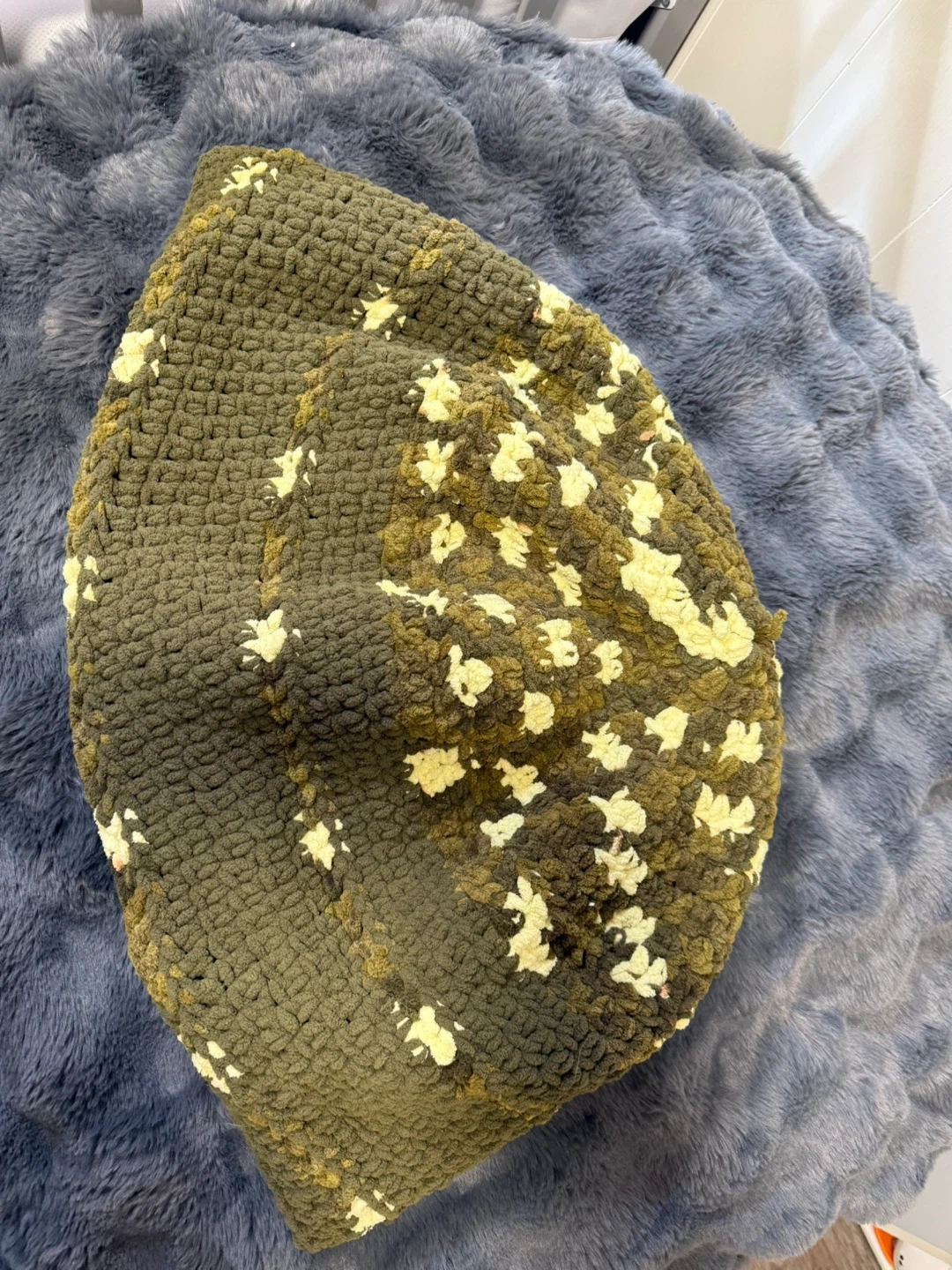 This is a handmade crochet storage basket, perfect for organizing toys or blankets. It features a textured knit with a green and cream speckled pattern. It's sturdy and would be a lovely addition to a nursery or playroom!
