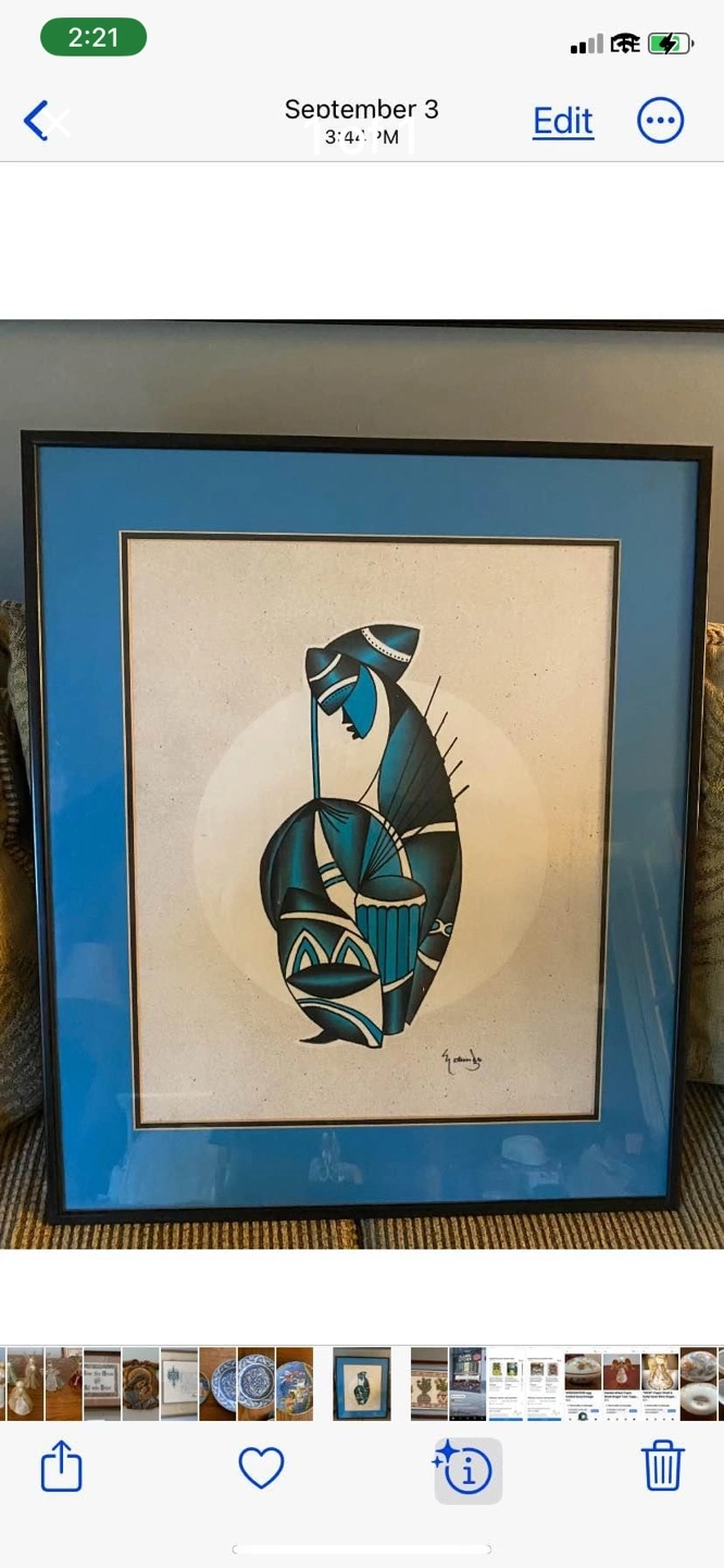 Beautiful framed artwork. Features a stylized figure in shades of blue and white. Artist signature visible in bottom right corner. Black frame with a teal mat.