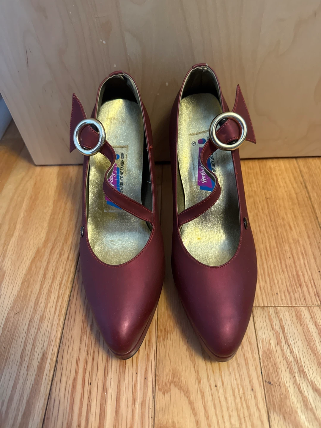 Cute pair of Mary Jane heels in a maroon colour. They're a size 8 (marked as 38 on the sole) however I don’t recommend this to those who have wider feet. They don’t fit me so I would recommend to people with around size 7 feet as they do run small. The insoles are lifting from the shoe but glue can fix that. No other damages