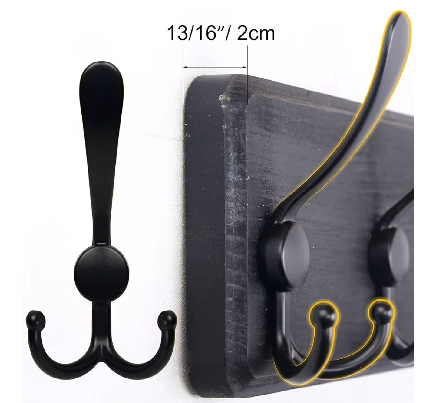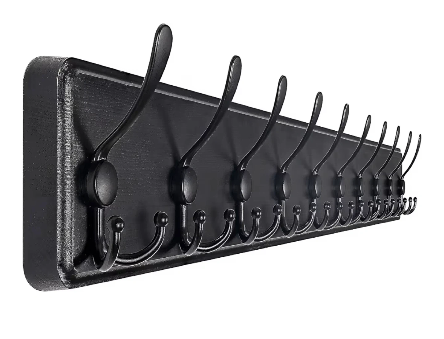 This black wooden coat rack features 10 durable hooks for hanging coats, hats, or scarves. It's made of solid wood and has a classic black finish. The overall length is 38.6 inches, with a depth of 4.3 inches.