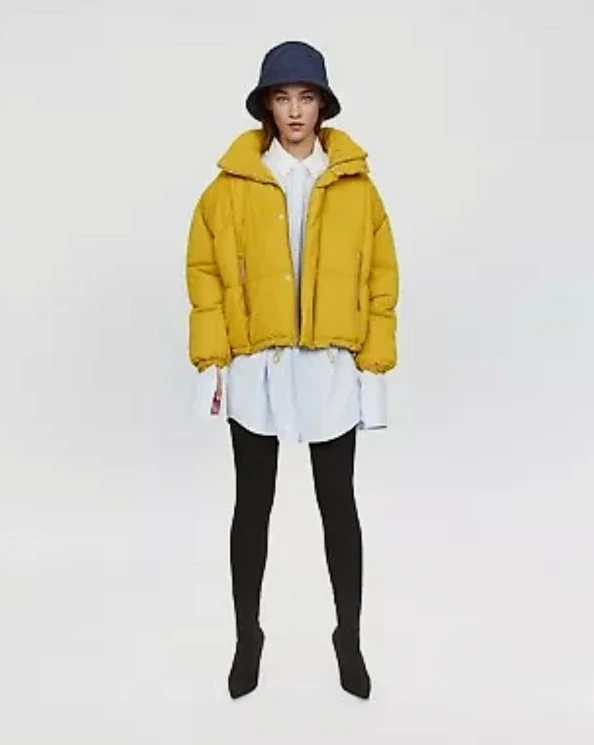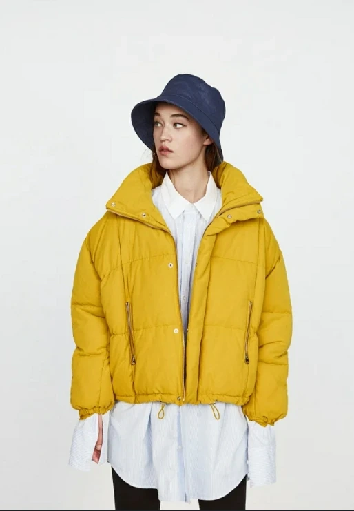 Warm and stylish mustard yellow puffer jacket. Soft like a down comforter. Cropped, relaxed fit, in a vibrant yellow colour. Features zipper and button closure, zippered pockets, drawstring to synch in waist and optional hood that stores right back into the collar.
