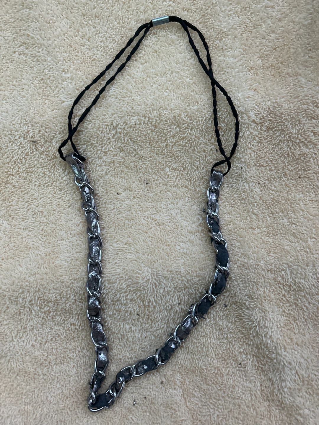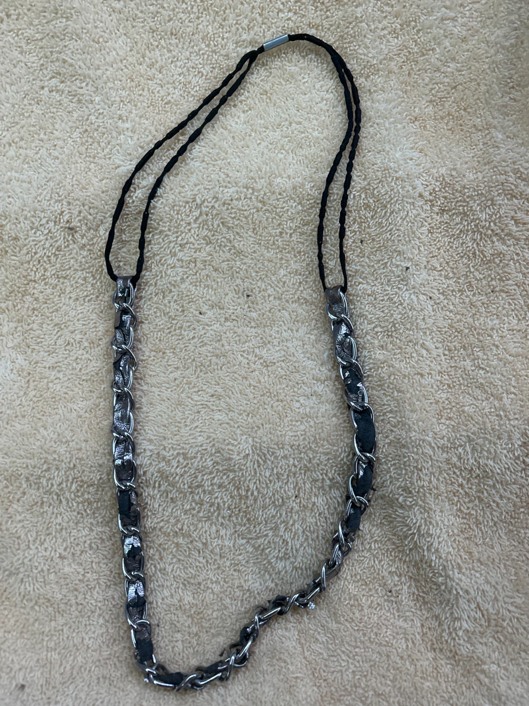 This headband features a stylish chain design intertwined with dark material. It has black elastic cords for a secure fit. A nice accessory to elevate your look!