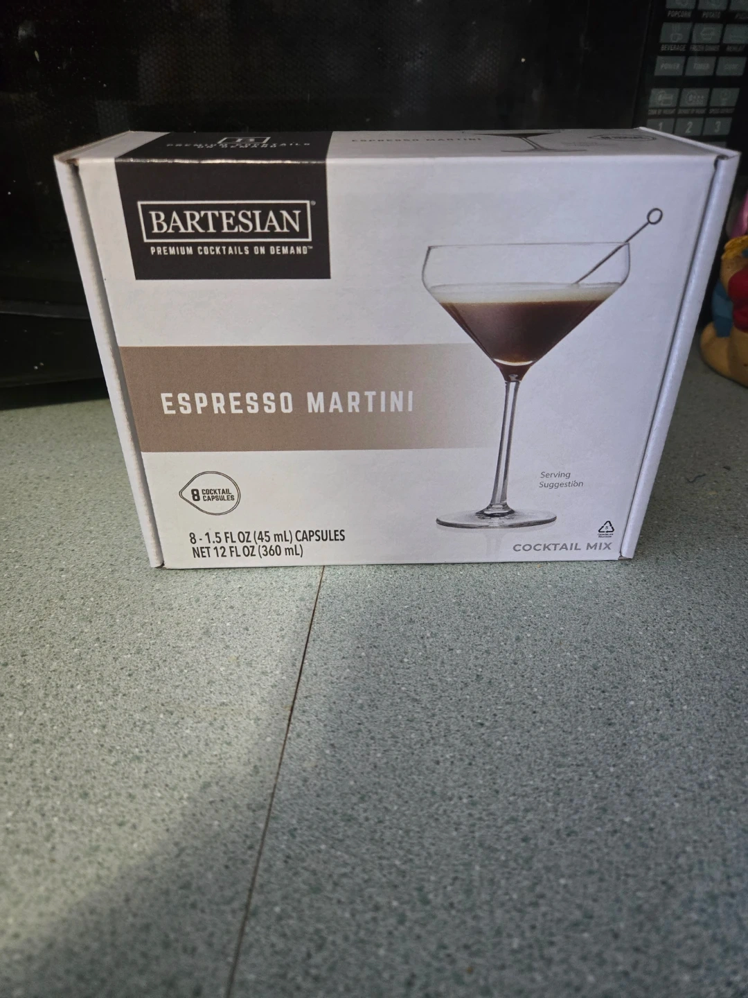 This is a box of Bartesian Espresso Martini cocktail mix capsules. It contains 8 capsules, each 1.5 fl oz, for a total of 12 fl oz. Each capsule makes one cocktail.