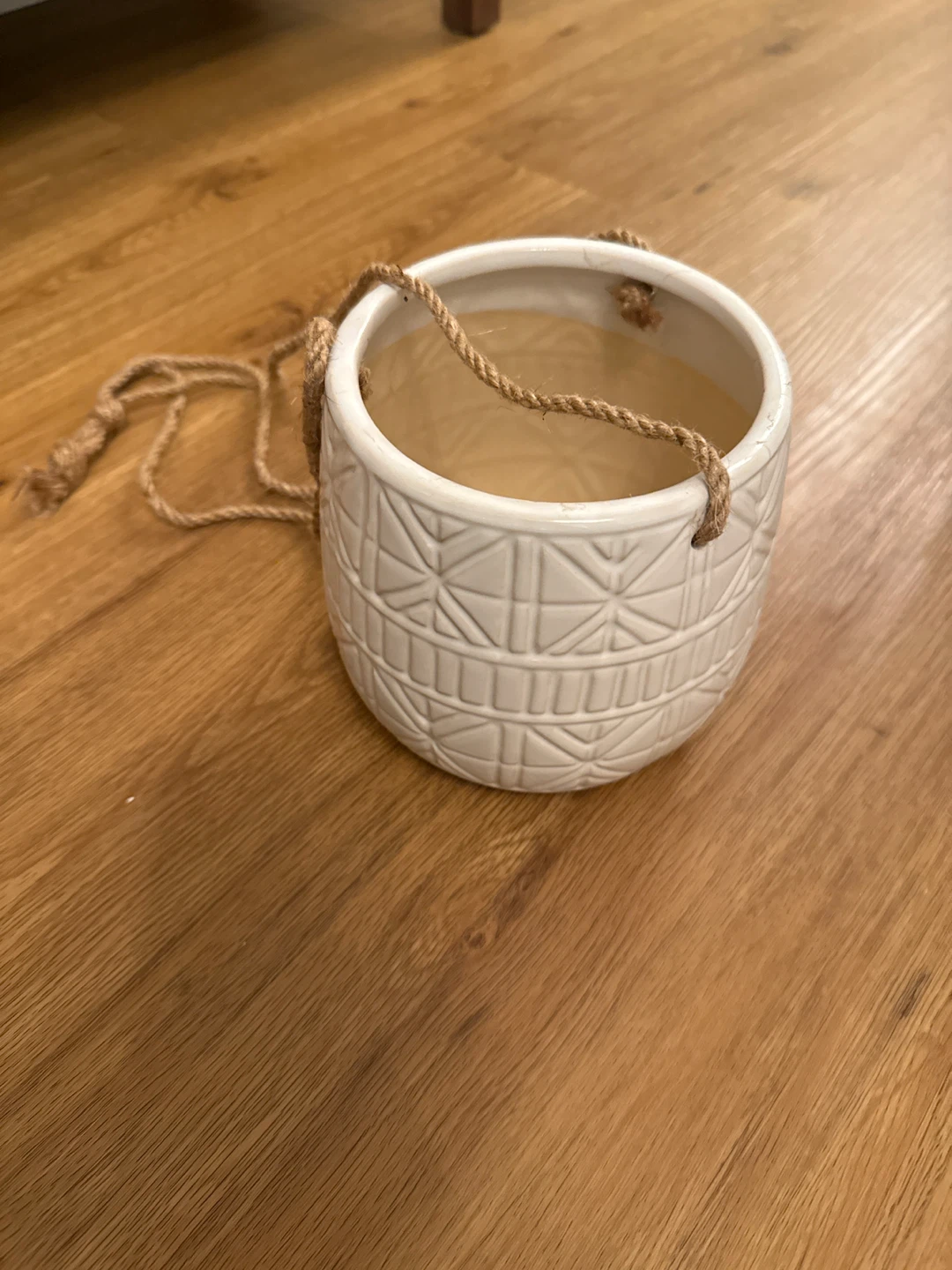 Here's a cute white ceramic hanging planter! It features a geometric design and a jute rope for hanging. It's in great condition and ready to add some greenery to your space