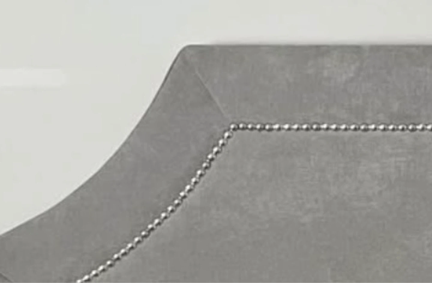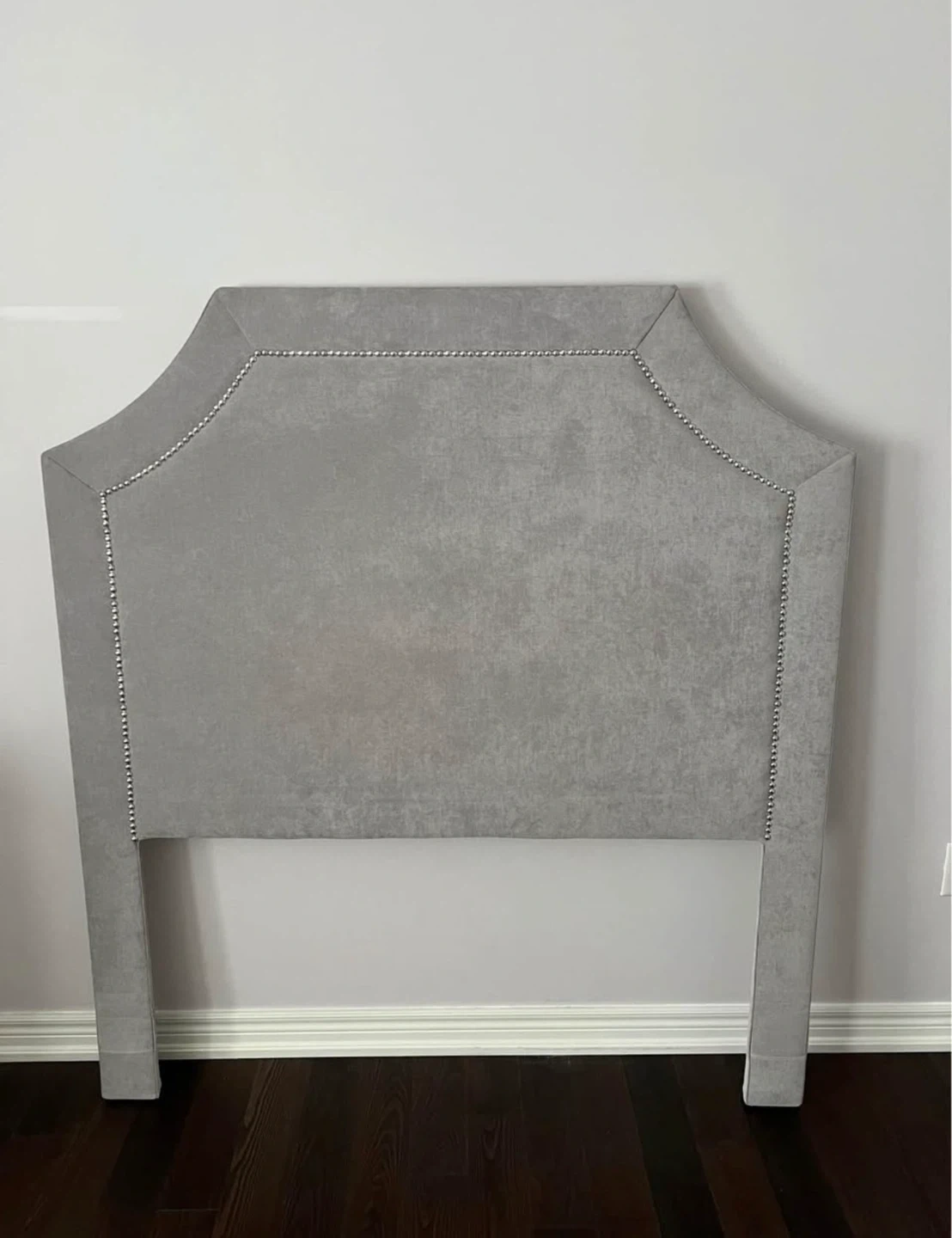 This upholstered headboard is covered in a soft grey velvet fabric and features decorative silver stud detailing along its sculpted edges. It's designed to attach to a standard bed frame. Adds a touch of elegance to any bedroom!