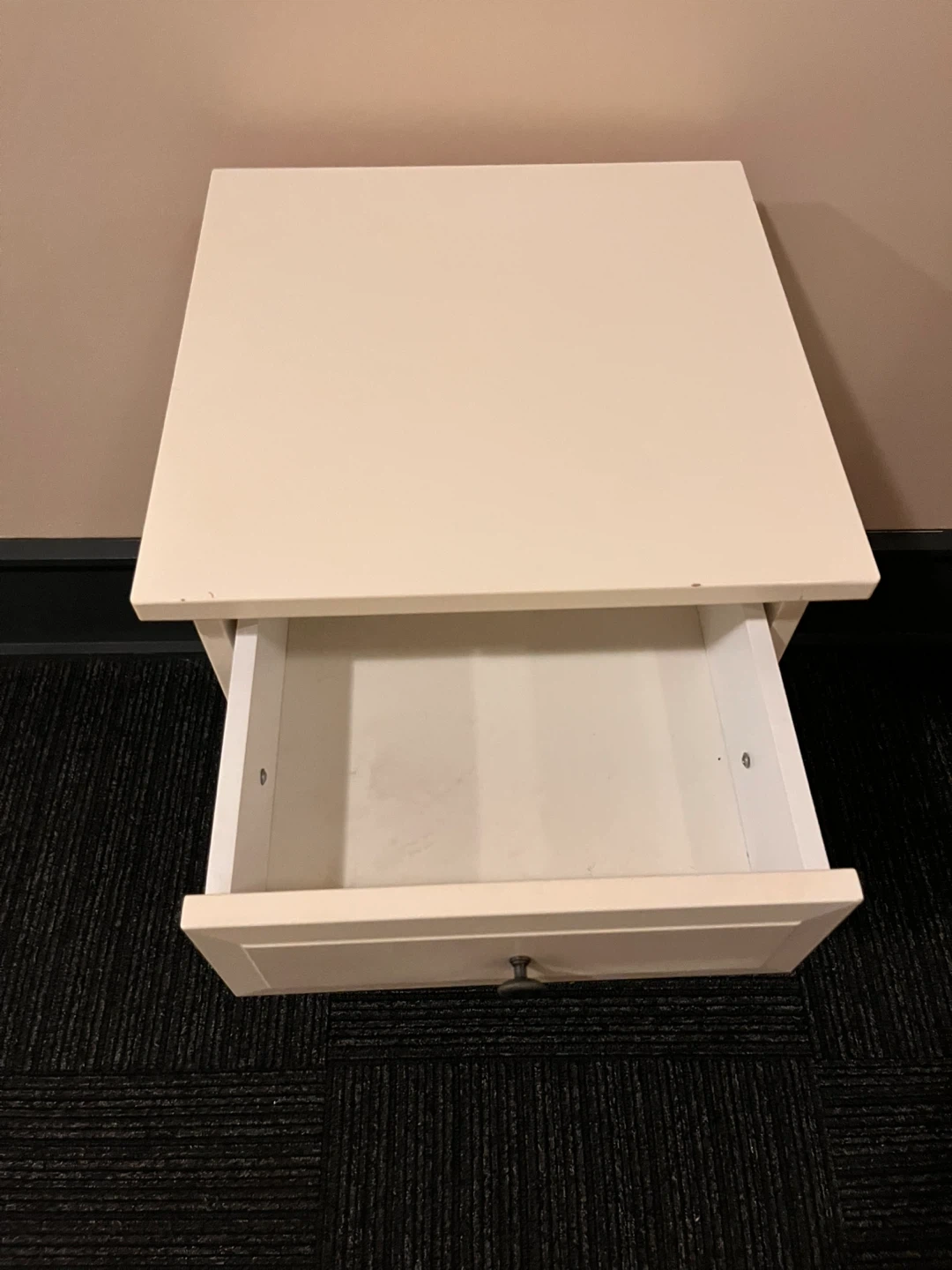 White nightstand featuring one drawer and a cabinet below. It's made of wood and has a single knob on the drawer and door. This would be useful for bedside storage or in a living room.