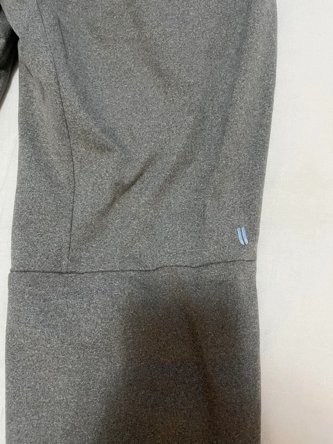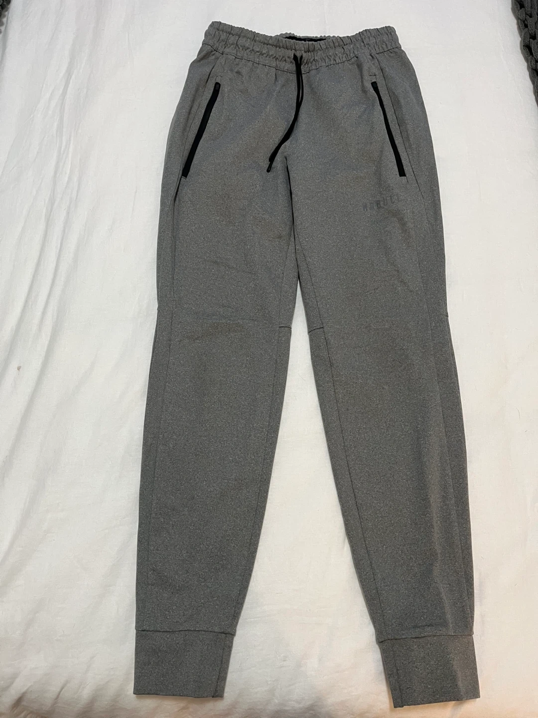 Grey NOBULL jogger pants. Made with 90% polyester and 10% spandex. They feature zippered pockets and an elastic waistband with a drawstring. Perfect for activewear or casual wear!