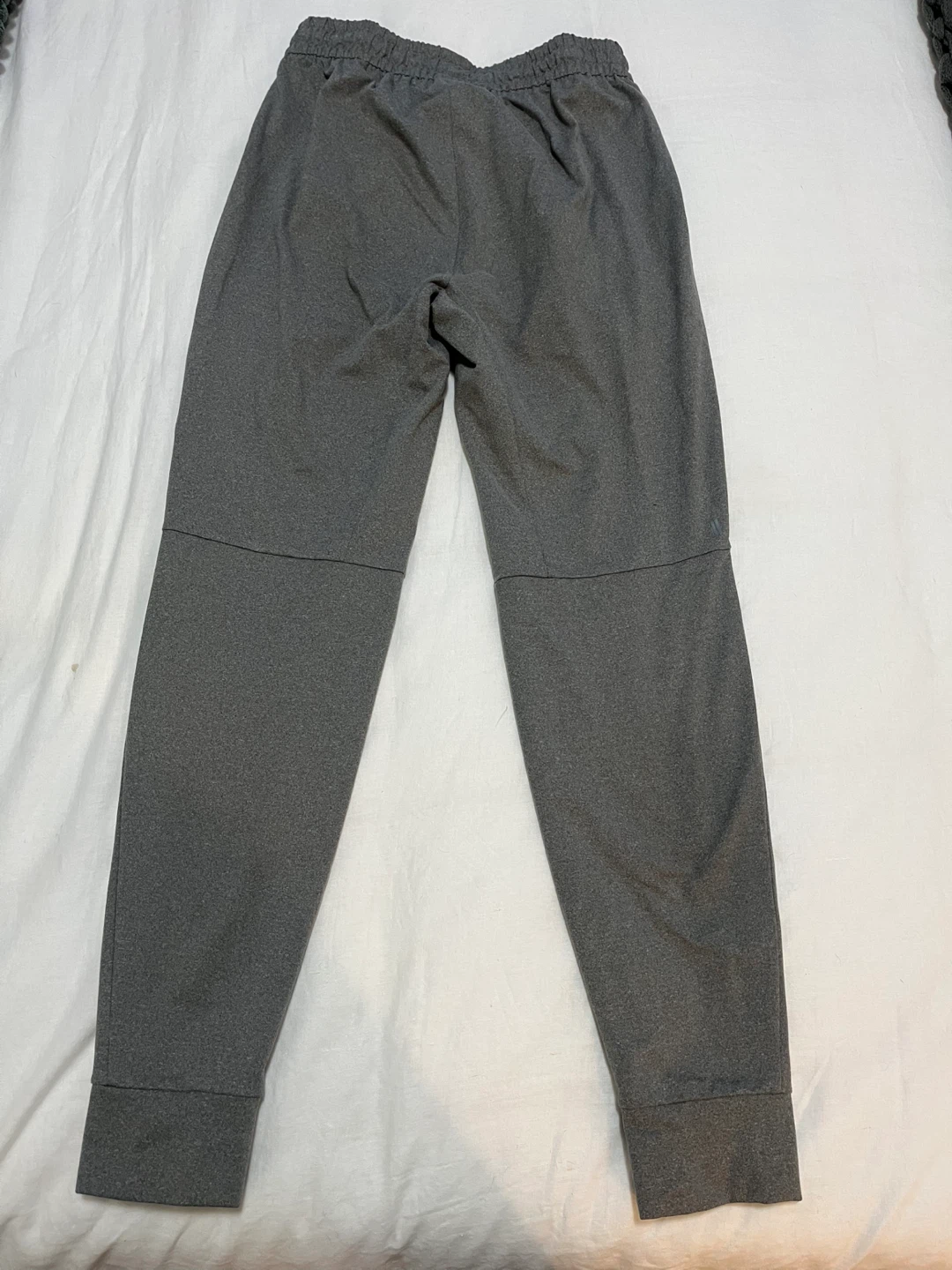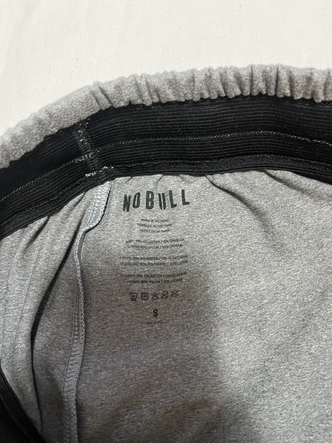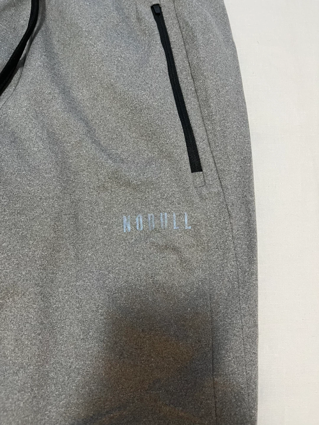 Grey NOBULL jogger pants. Made with 90% polyester and 10% spandex. They feature zippered pockets and an elastic waistband with a drawstring. Perfect for activewear or casual wear!
