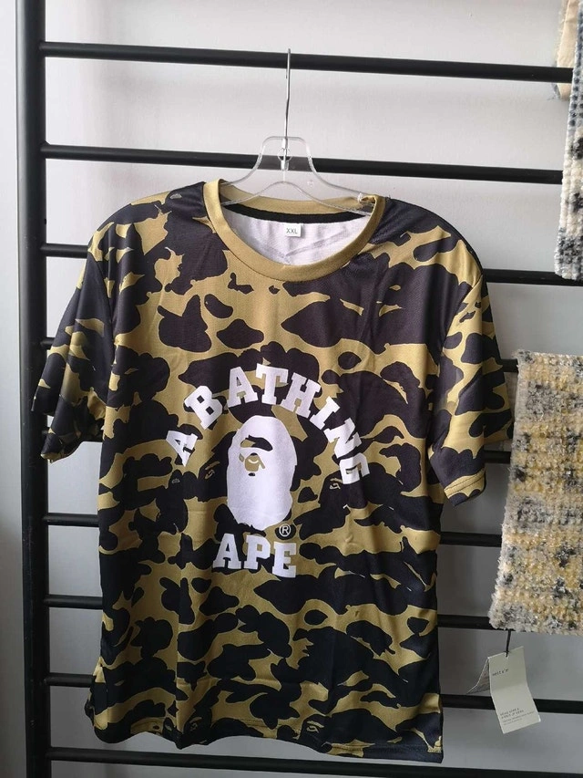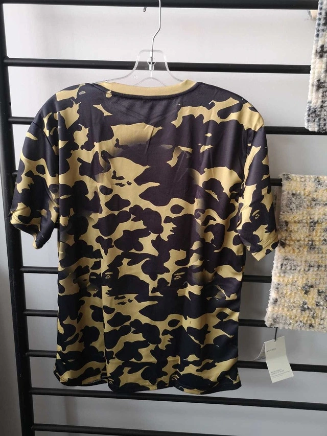 Level up your streetwear game with this A Bathing Ape (BAPE) t-shirt, featuring a distinctive yellow camo pattern and the iconic BAPE logo. This shirt is in used condition, so you can rock a piece of high-end streetwear at a fraction of the original price. It's perfect for adding a bold statement to your wardrobe! * Size: youth XL or men S Looking for a fresh new style? This shirt has got you covered. Don't miss out—if the ad is up, it's still available!