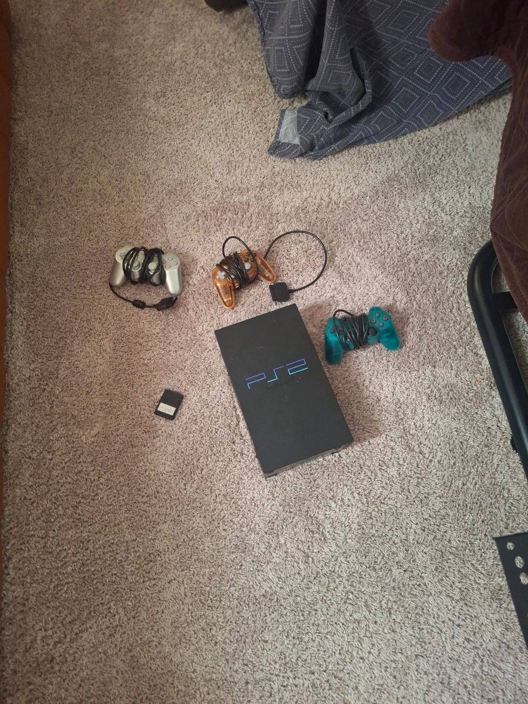This is a PlayStation 2 console. It comes with three controllers, two of which are clear orange and teal. A memory card is also included. It's a great addition to any retro gaming setup!