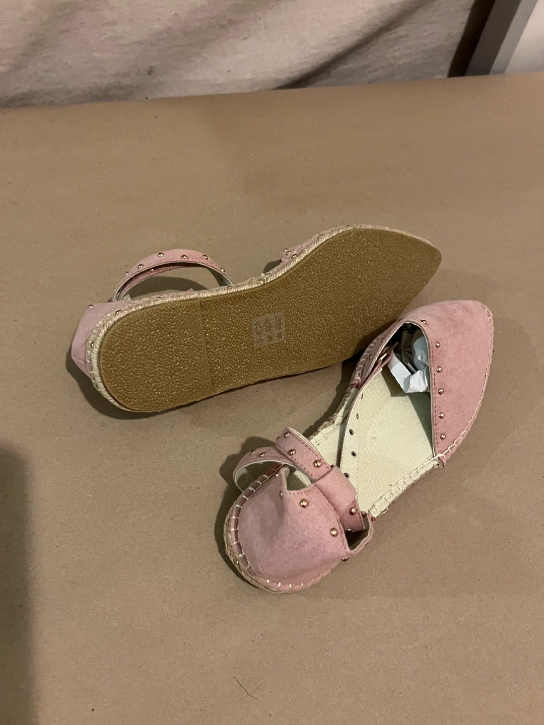 Brand new pink suede espadrille flats with gold stud embellishment. Features ankle strap and a pointed toe. Real cute!