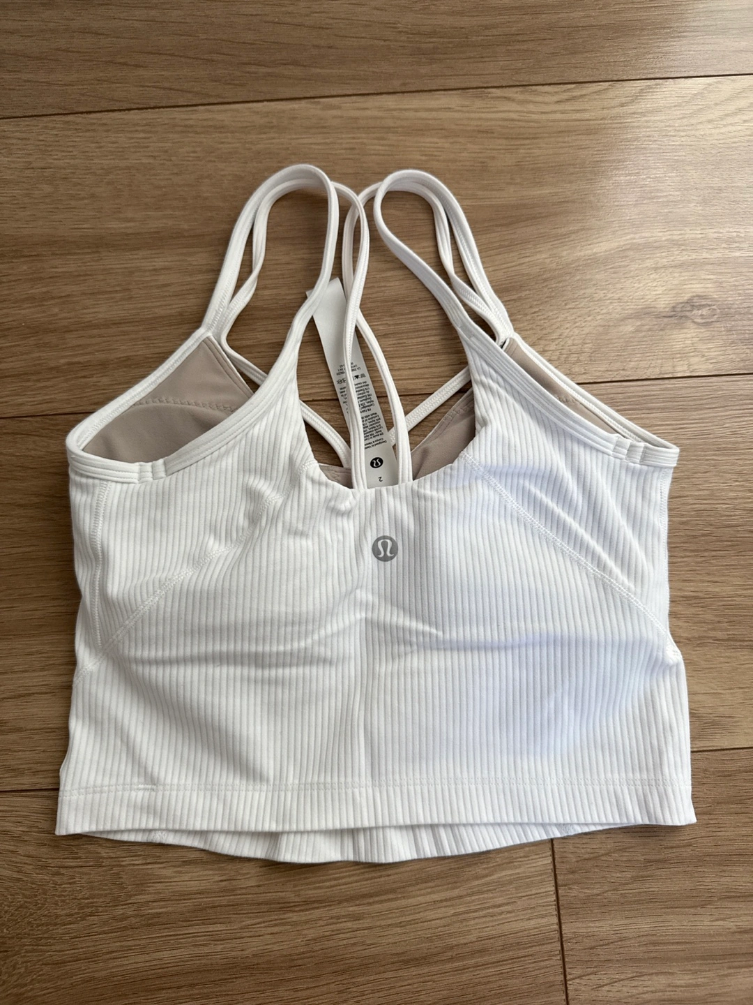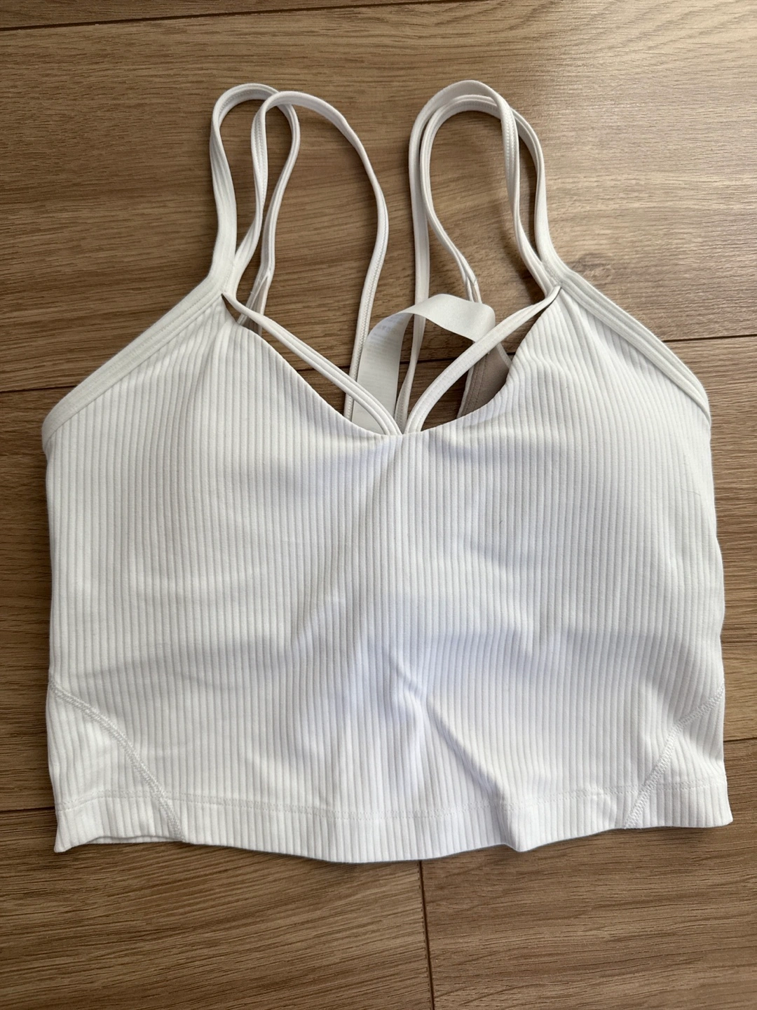 White ribbed crop top. Cross-back design. Size 2. Perfect for yoga or everyday wear. Too tight on me. Wrinkle from storage only.