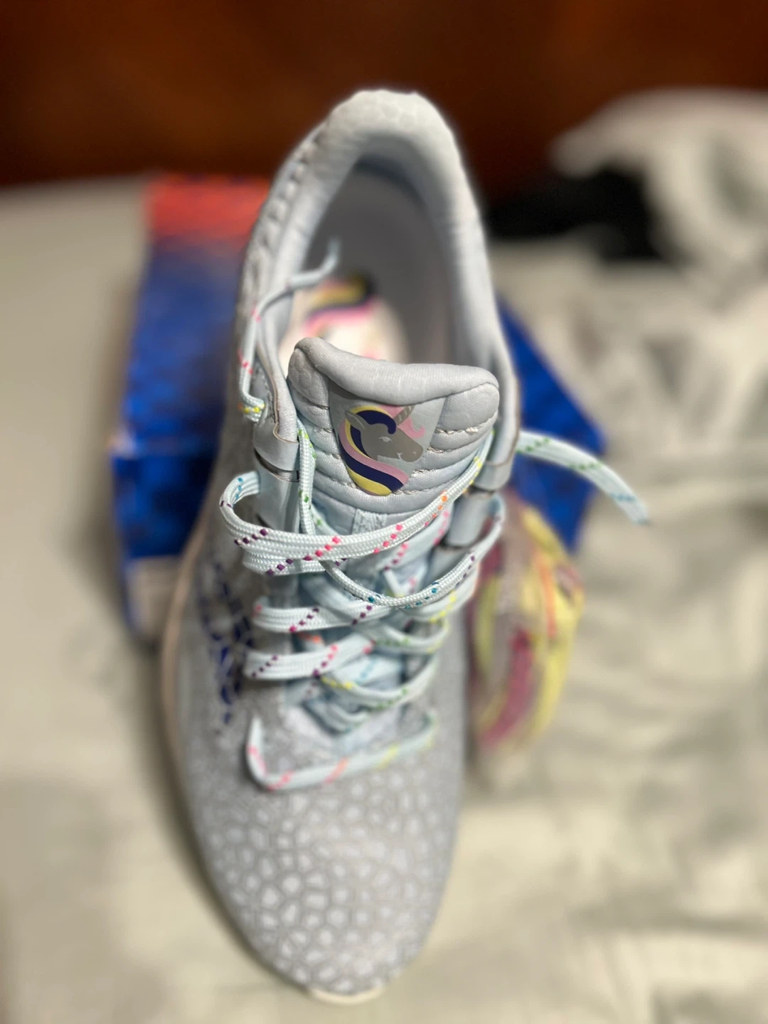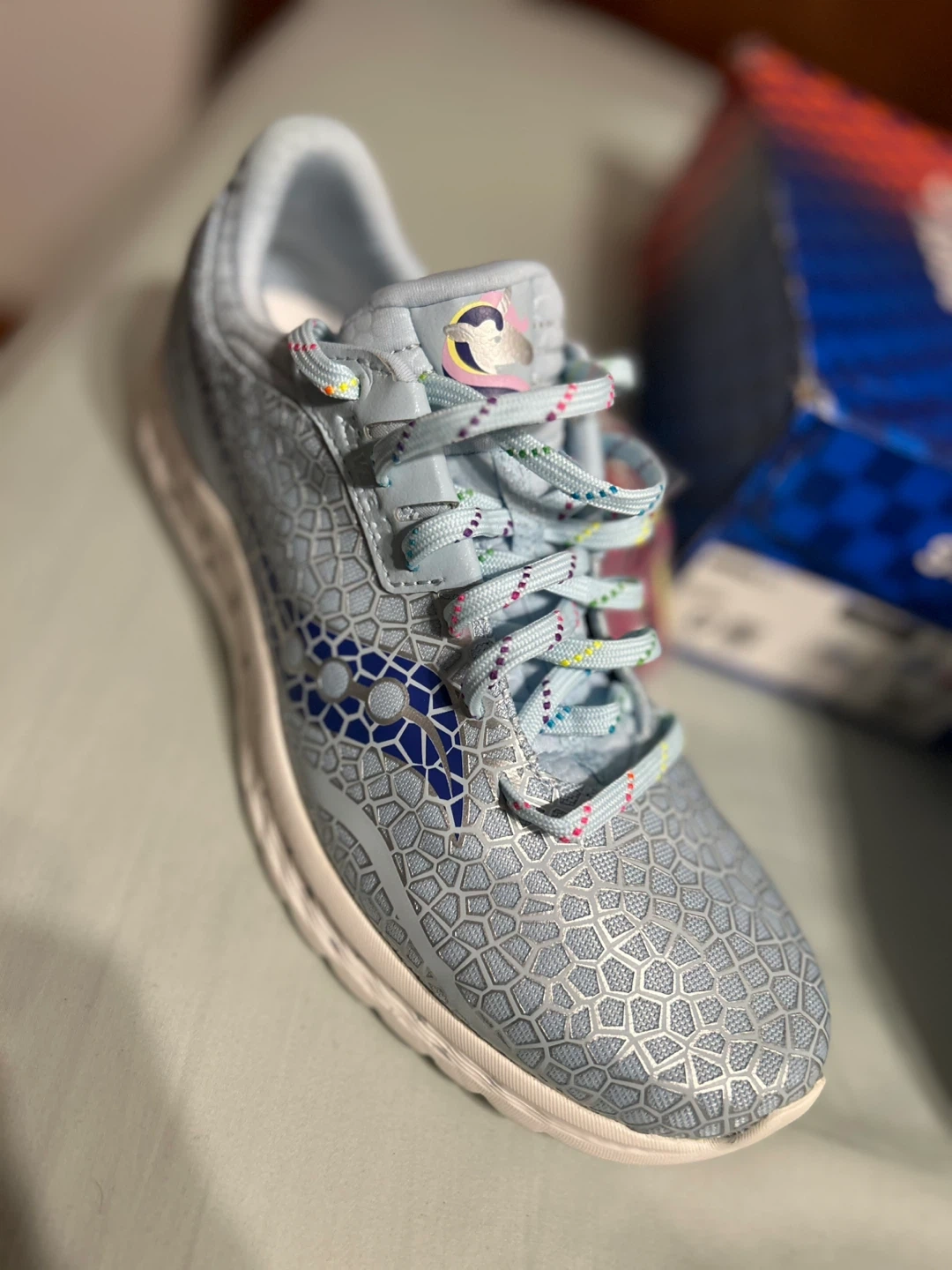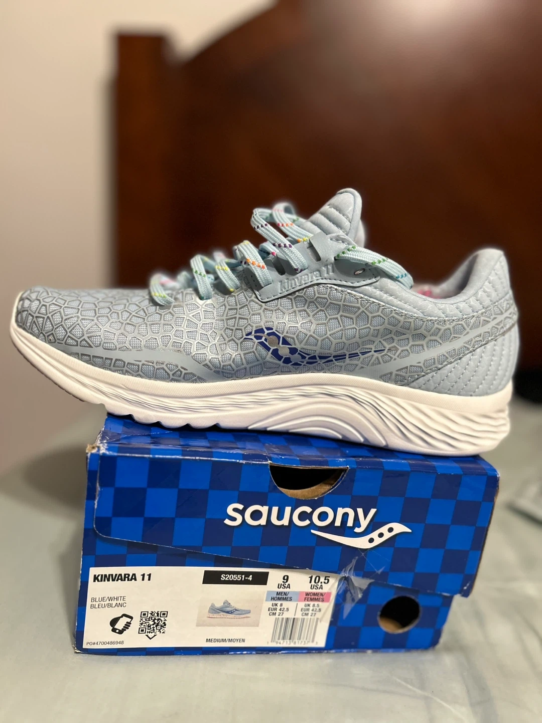 Selling a pair of Saucony Kinvara 11 , size 9/men, 10.5/women, running shoes! They are in new condition and come with the original box. The shoes feature a unique blue and silver honeycomb pattern and colorful laces. Perfect for running or everyday wear!