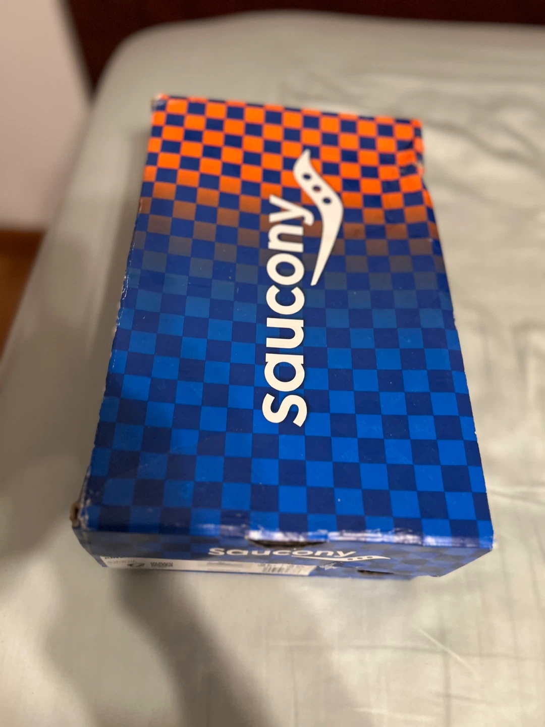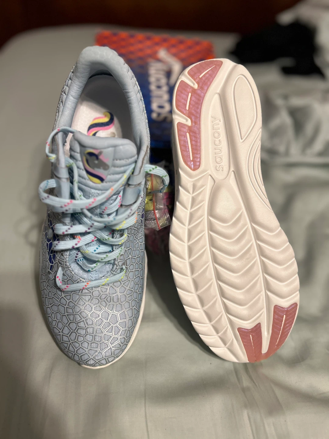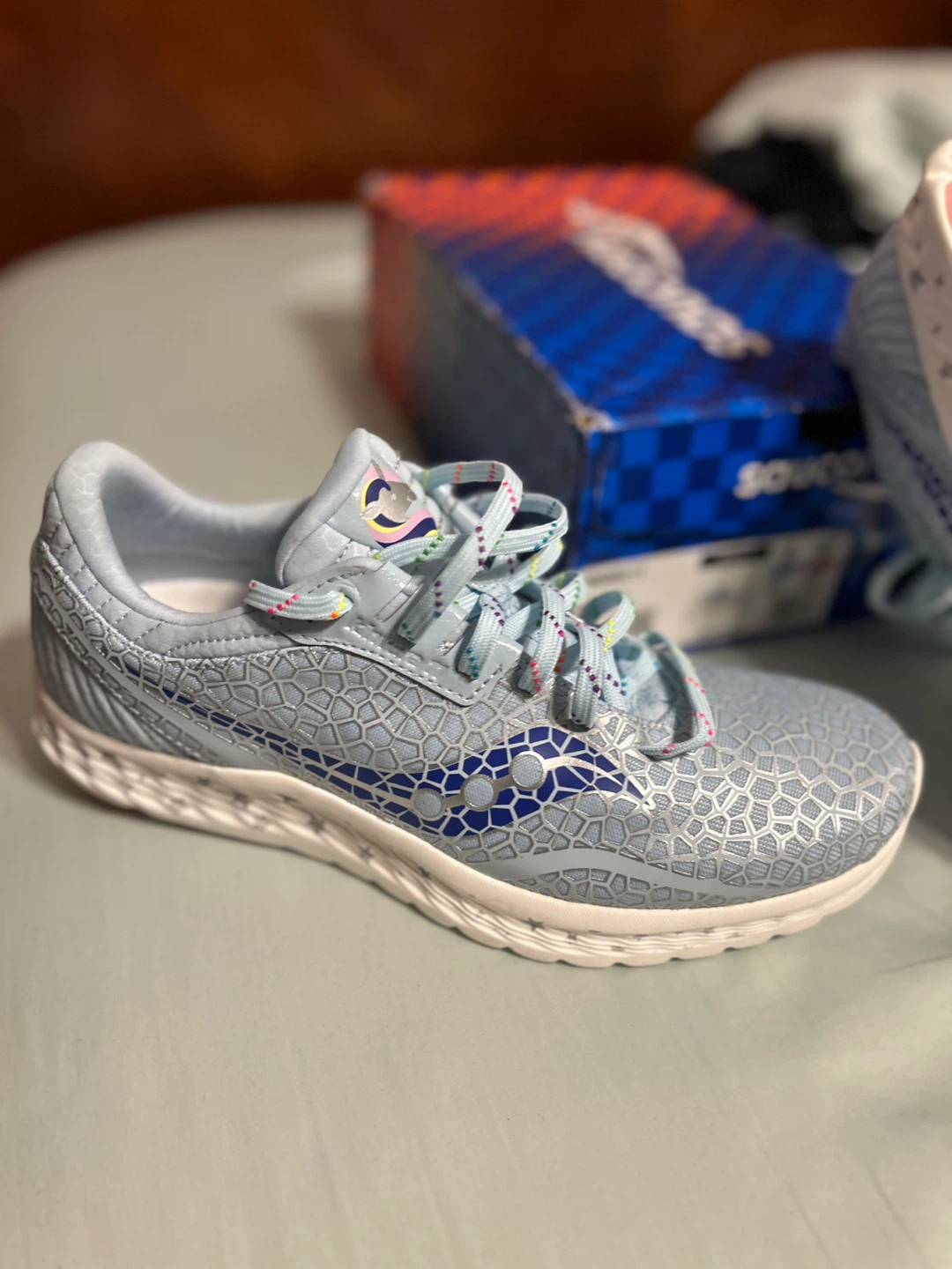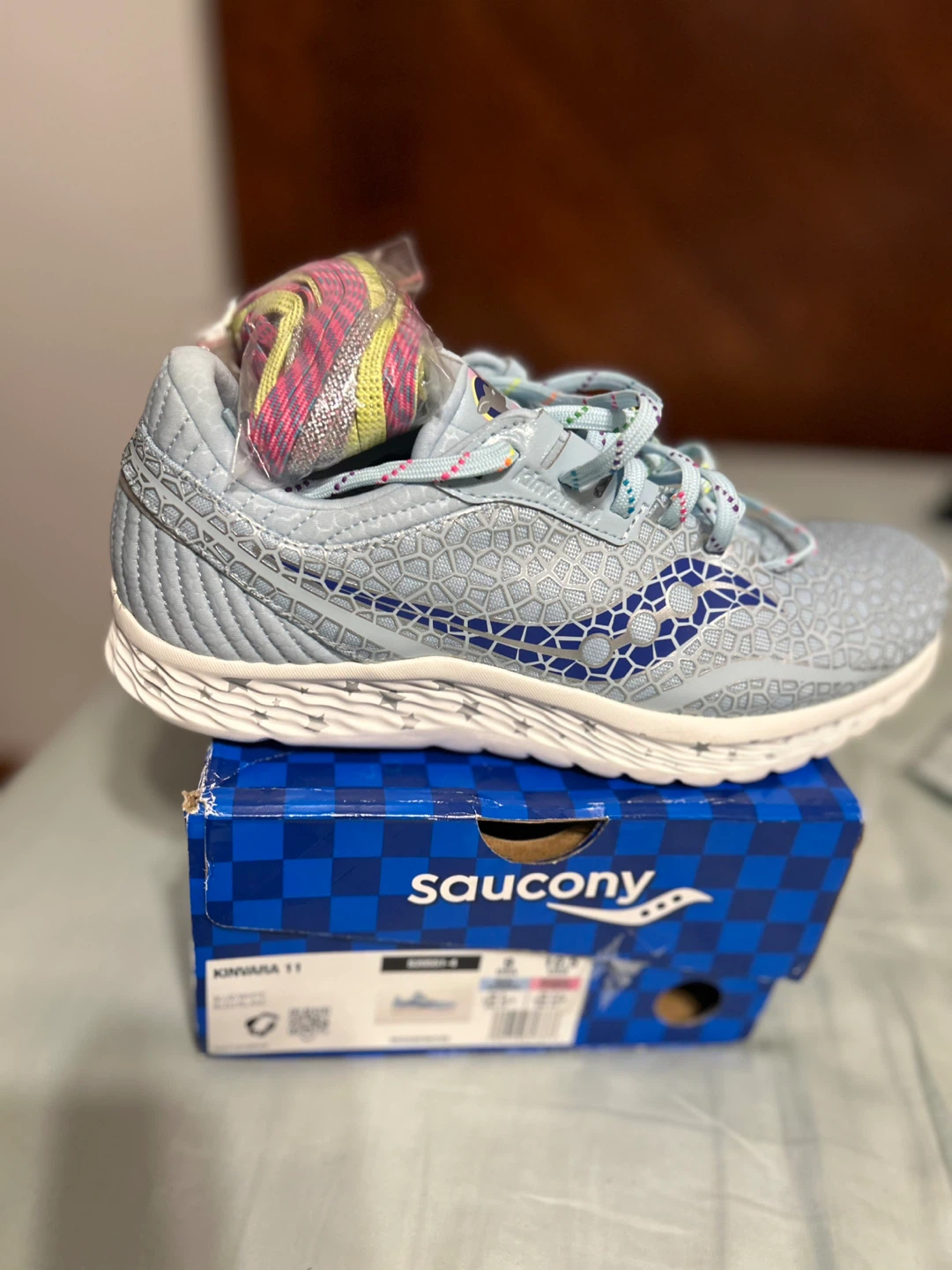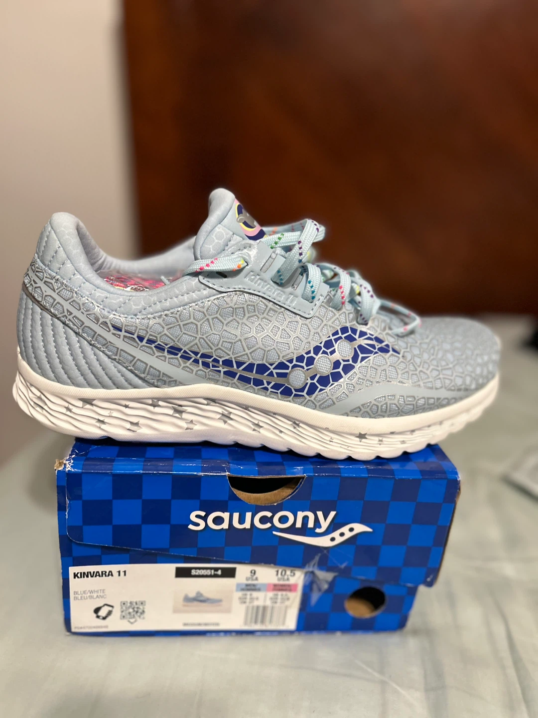 Selling a pair of Saucony Kinvara 11 , size 9/men, 10.5/women, running shoes! They are in new condition and come with the original box. The shoes feature a unique blue and silver honeycomb pattern and colorful laces. Perfect for running or everyday wear!
