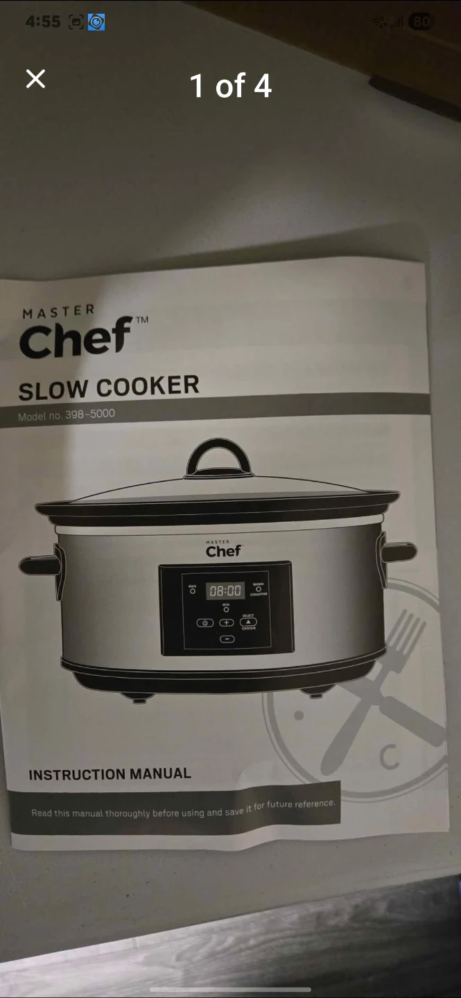 Master Chef slow cooker, model 398-5000. It's a handy kitchen appliance for preparing slow-cooked meals. This instruction manual will guide you through its use and care.