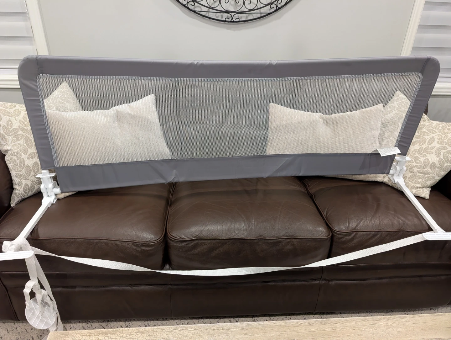 This is a grey mesh bed rail for safety. It's designed to prevent falls from beds. Includes straps for secure attachment.