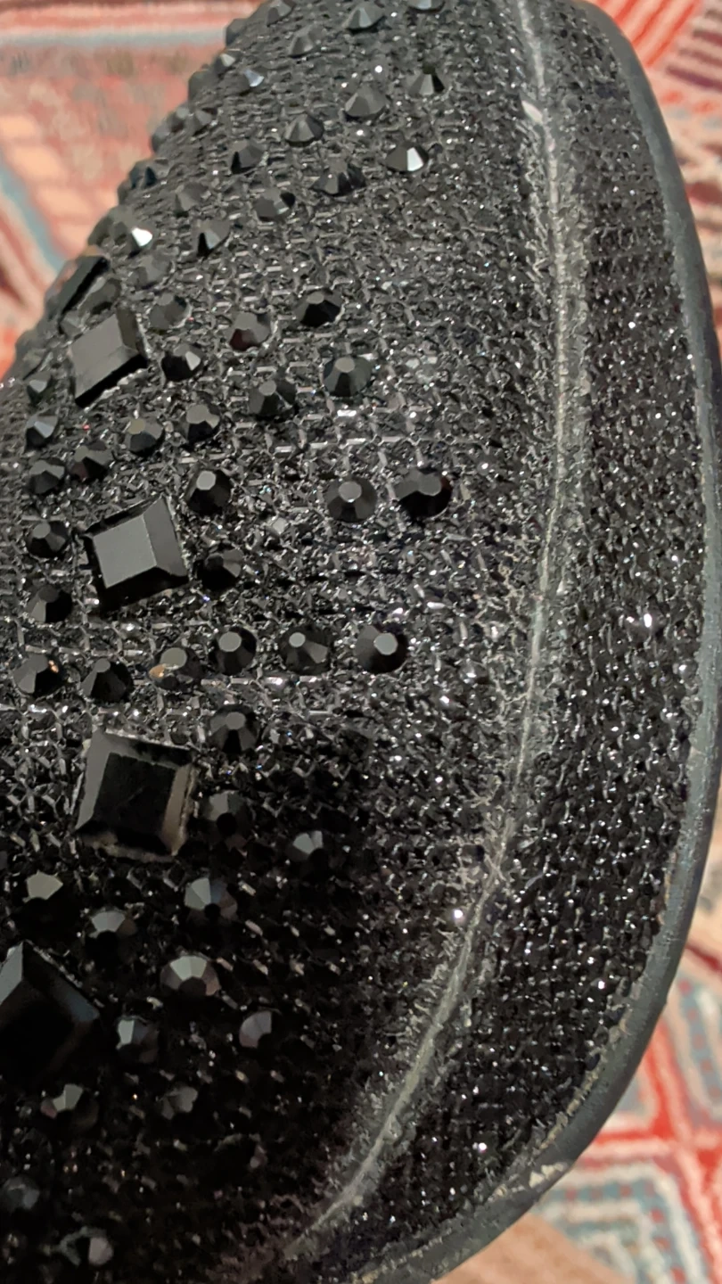 Sparkly black heels covered in rhinestones. These are a women's size 37. Perfect for a night out!