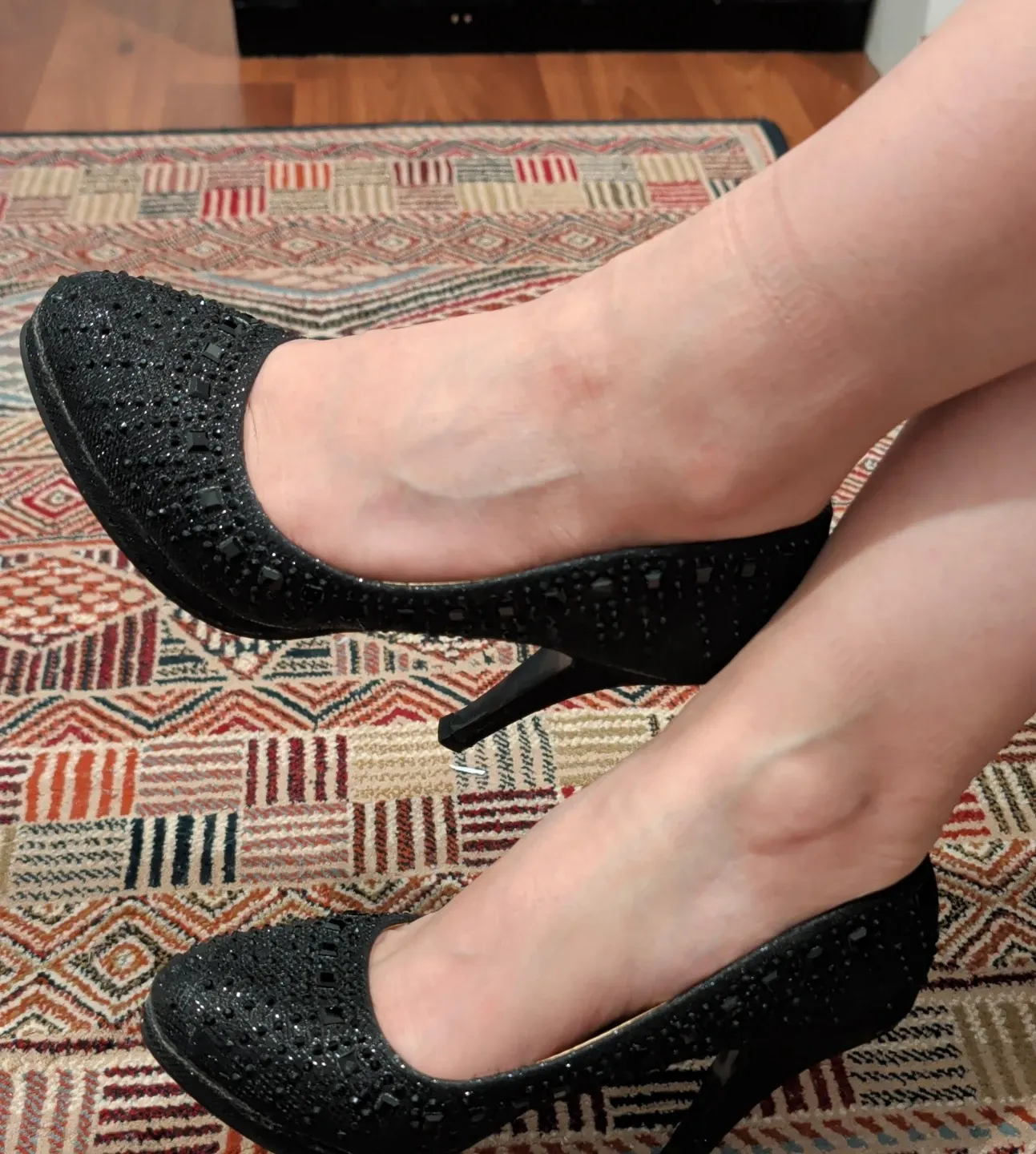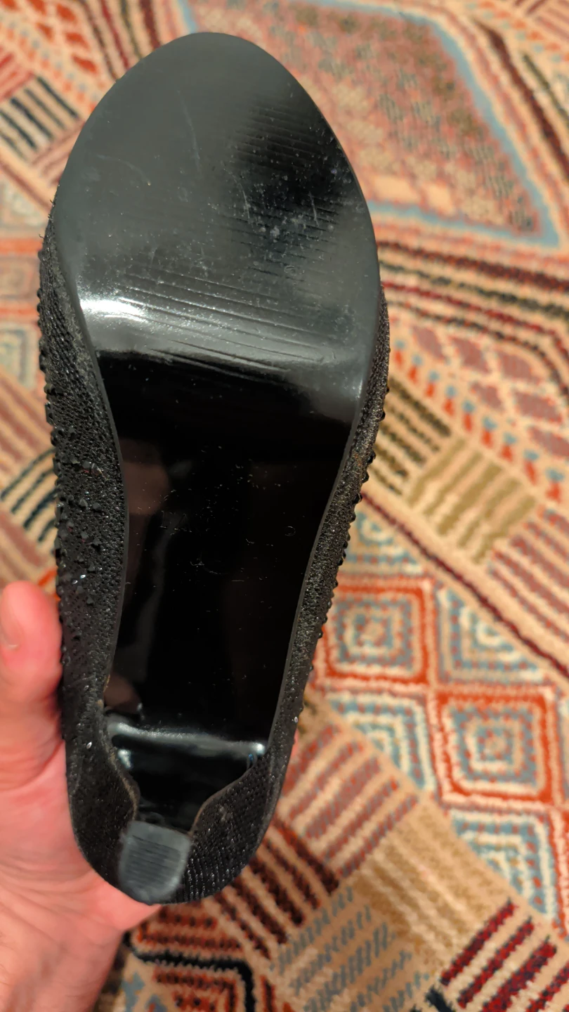 Sparkly black heels covered in rhinestones. These are a women's size 37. Perfect for a night out!
