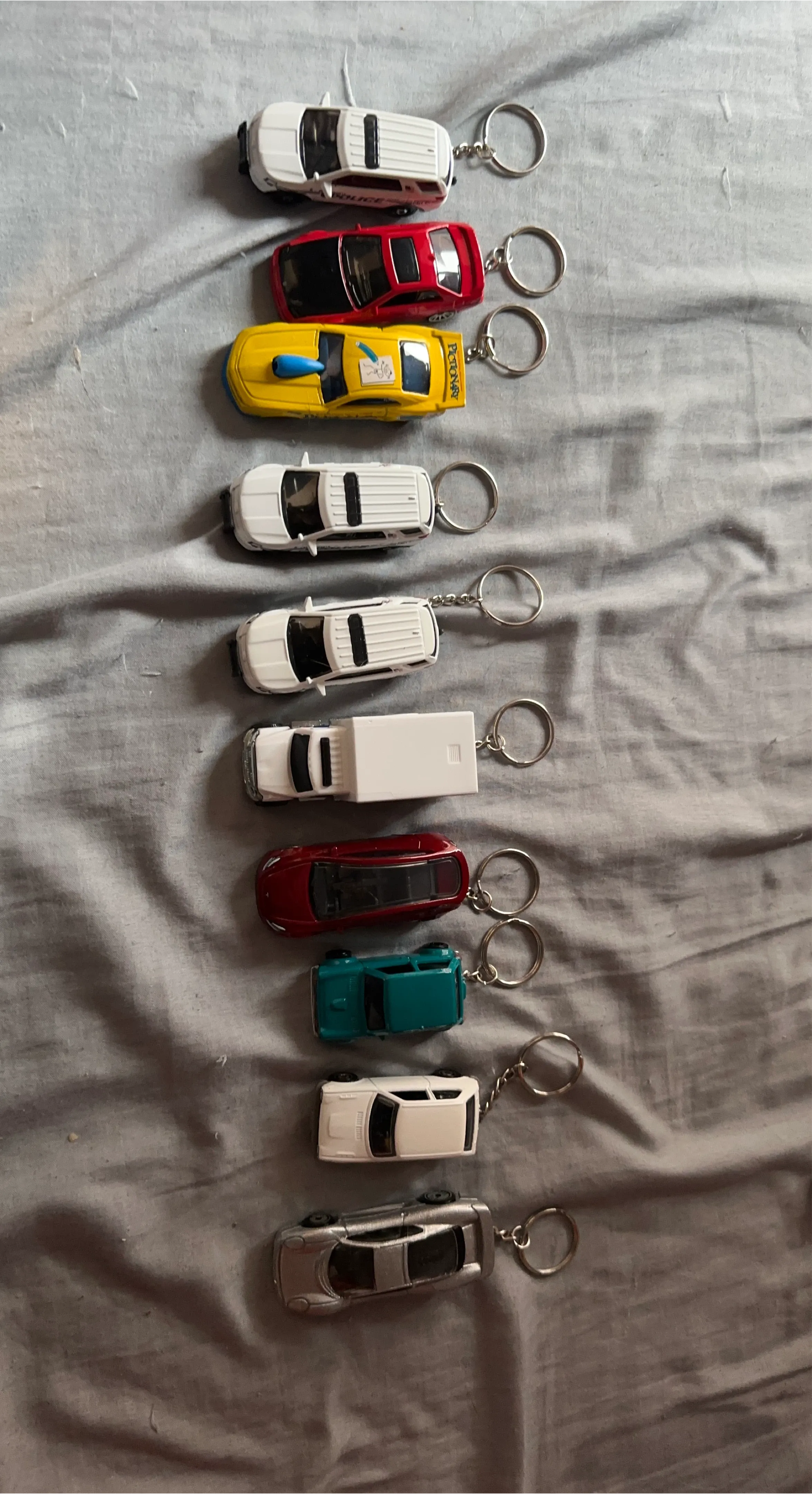 Collection of 9 die-cast car keychains in various colours including white, red, yellow, teal, and silver. Some cars have 'Police' or 'Pictionary' labels. These are fun accessories for your keys!